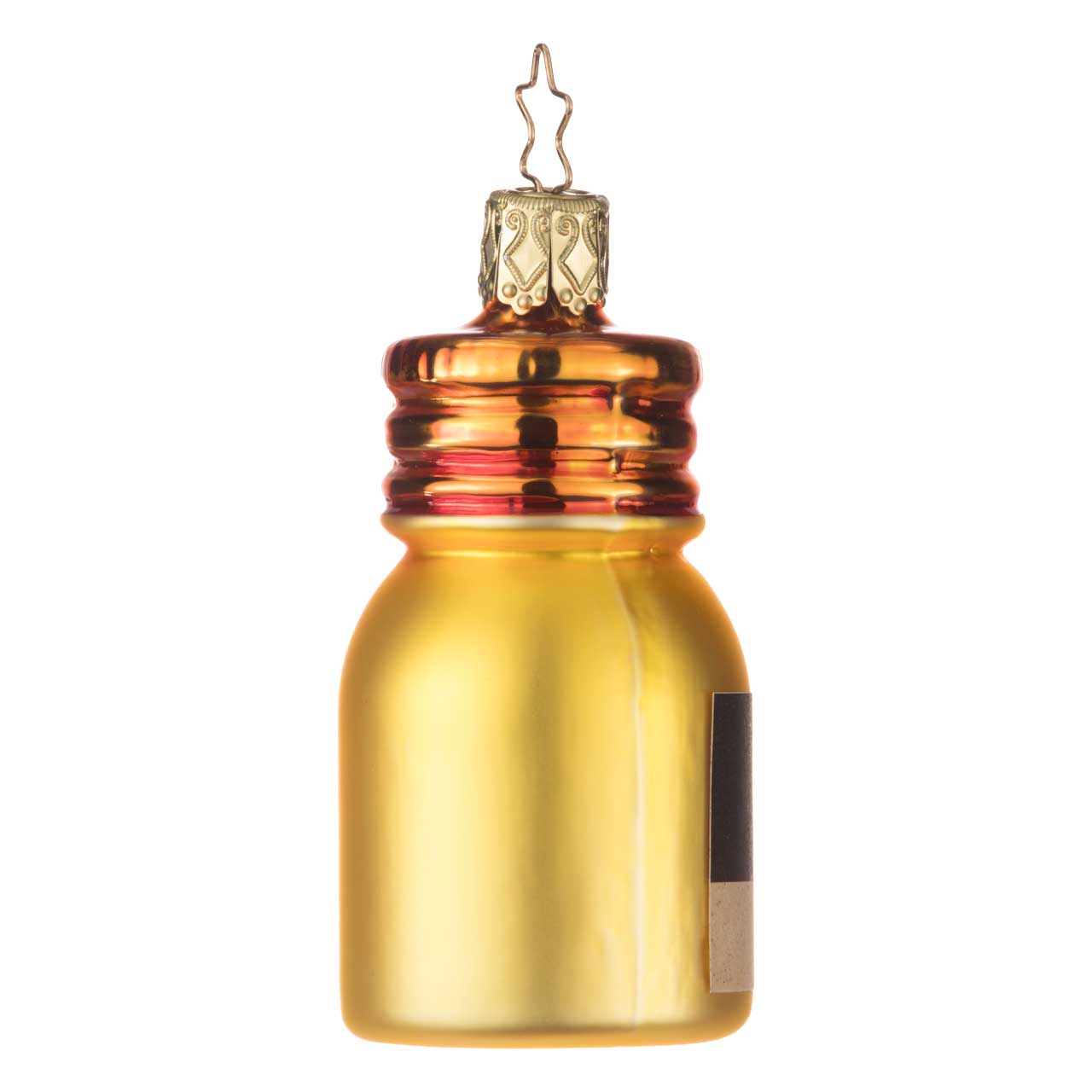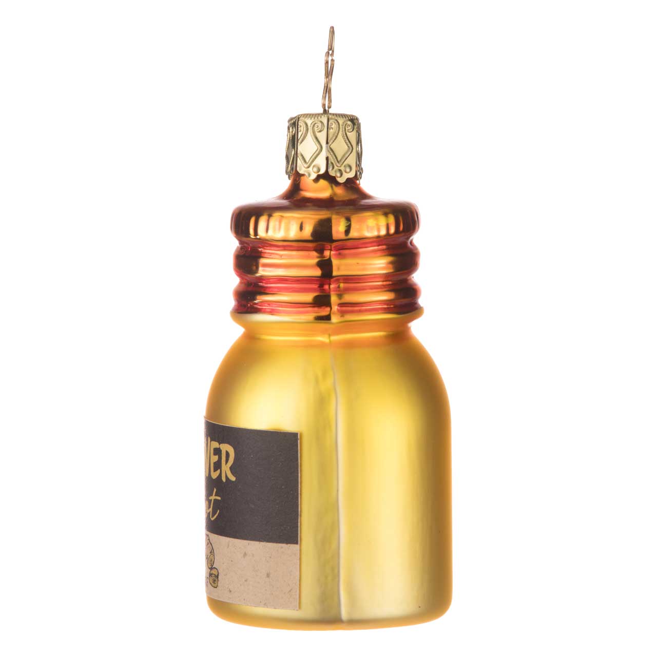 Die kleine Flasche ist unten rundlich und kompakt, nach oben hin mit abgestuftem Hals. Der Körper erstrahlt in satter Goldfarbe, während der Deckel in rötlich schimmernden Akzenten glänzt. Auf der Vorderseite befindet sich ein Etikett mit der Aufschrift „Ingwer Shot – Scharf“ und einer feinen Illustration einer Ingwerwurzel.