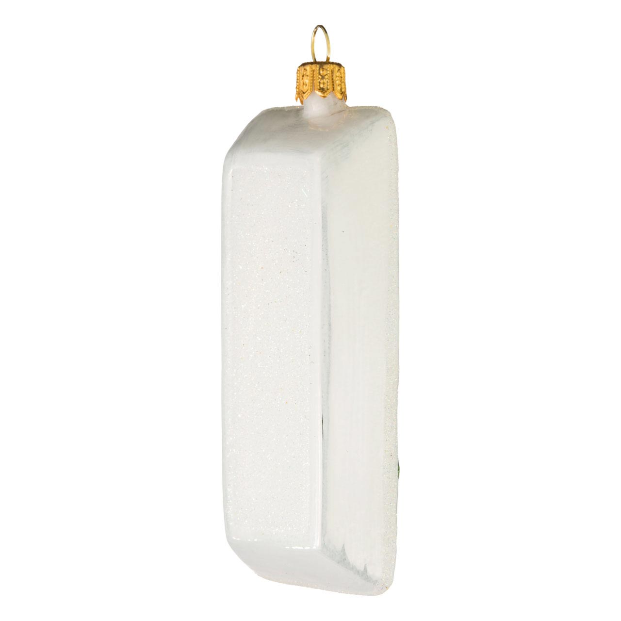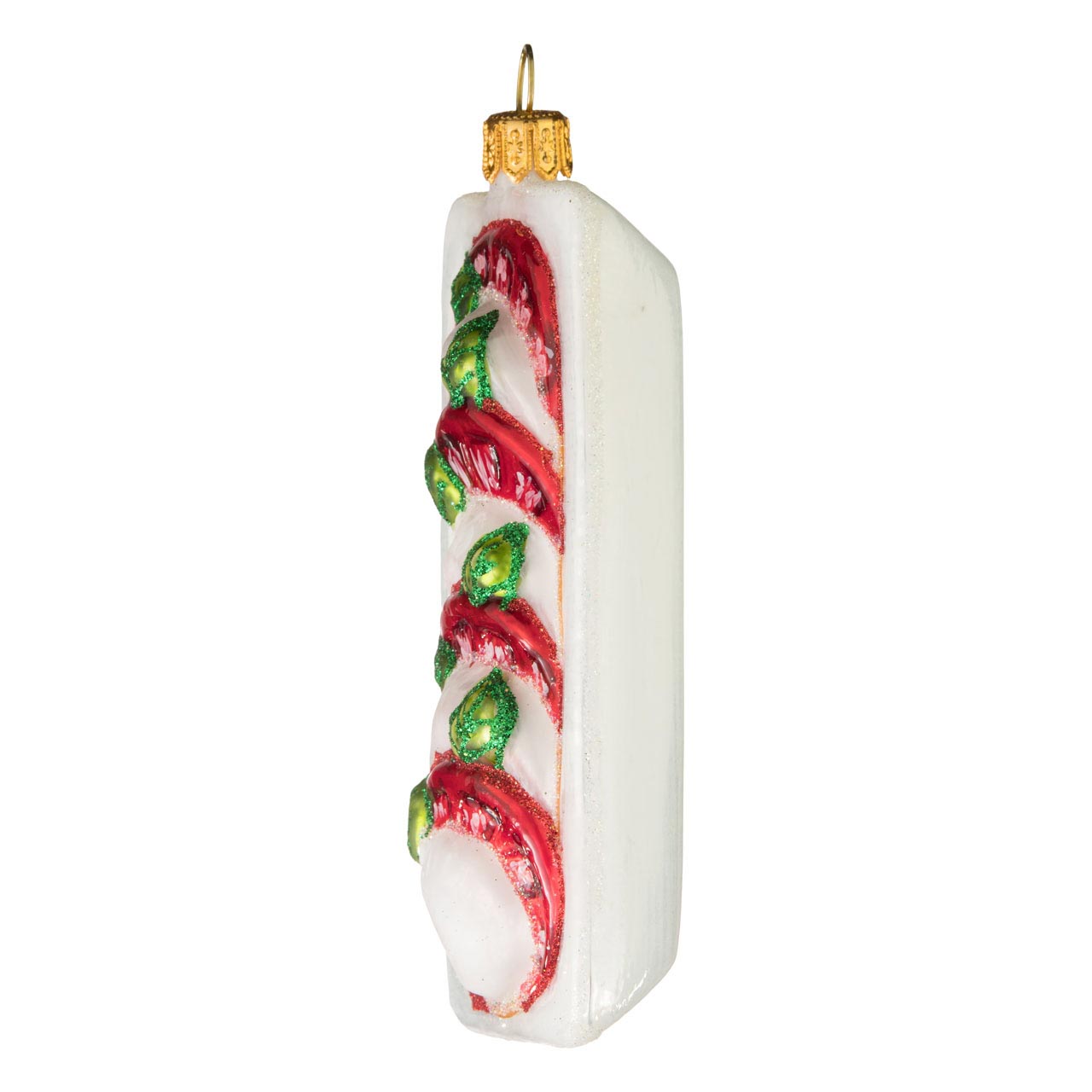 Ab sofort können Italien-Fans wie Gourmets ihr Lieblingsessen zu Weihnachten jedoch nicht nur auf dem Tisch servieren, sondern auch in besonders kunstvoller Form in den Baum hängen. Auf einer weißen, glänzenden, rechteckigen Schale garniert, deren Rand wie Boden mit weißem Glitzerstaub verziert wurde, präsentieren sich vier erntereif-rote Tomatenscheiben im Wechsel zu ebensovielen Mozarellascheiben. Grüner Glitter hebt die Konturen der Basilikumblattadern hervor und sorgt für einen wahren Wow-Effekt.