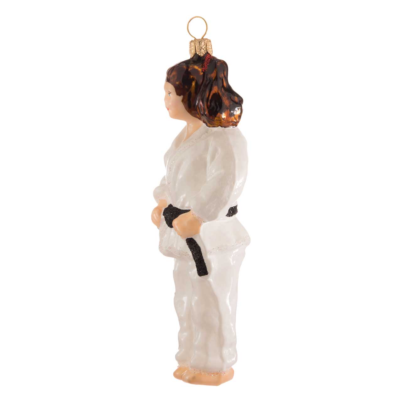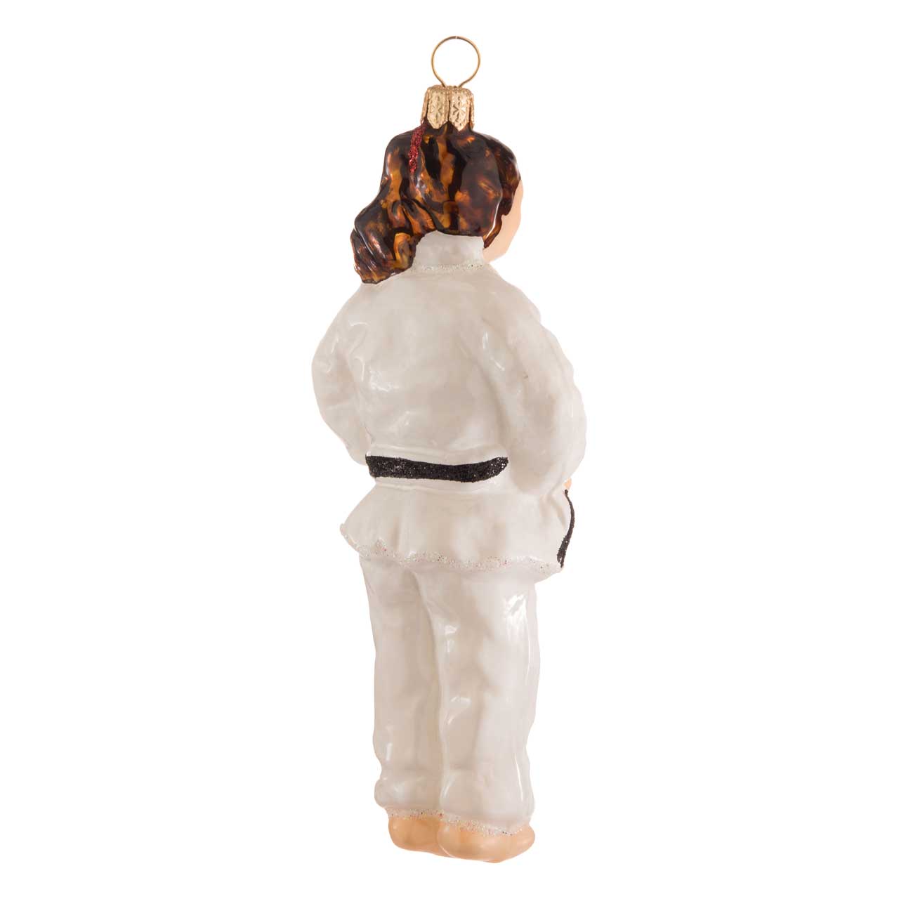 Für Judo-Fans, die auch an Weihnachten ihr Hobby nicht nur im Herzen bei sich tragen wollen, kommt diese Glasfigur für den Tannenbaum vermutlich wie gerufen: Als konzentrierte, aufrecht stehende Judoka kommt die junge Dame nämlich mit hohem braunen Pferdeschwanz sowie im charakteristischen, weißen Anzug daher - mit weiter Hose und dazugehöriger Wickeljacke. Ein schwarzer Gürtel verrät dabei aussagekräftig ihre Kampfkunstfähigkeiten: Meisterlevel.