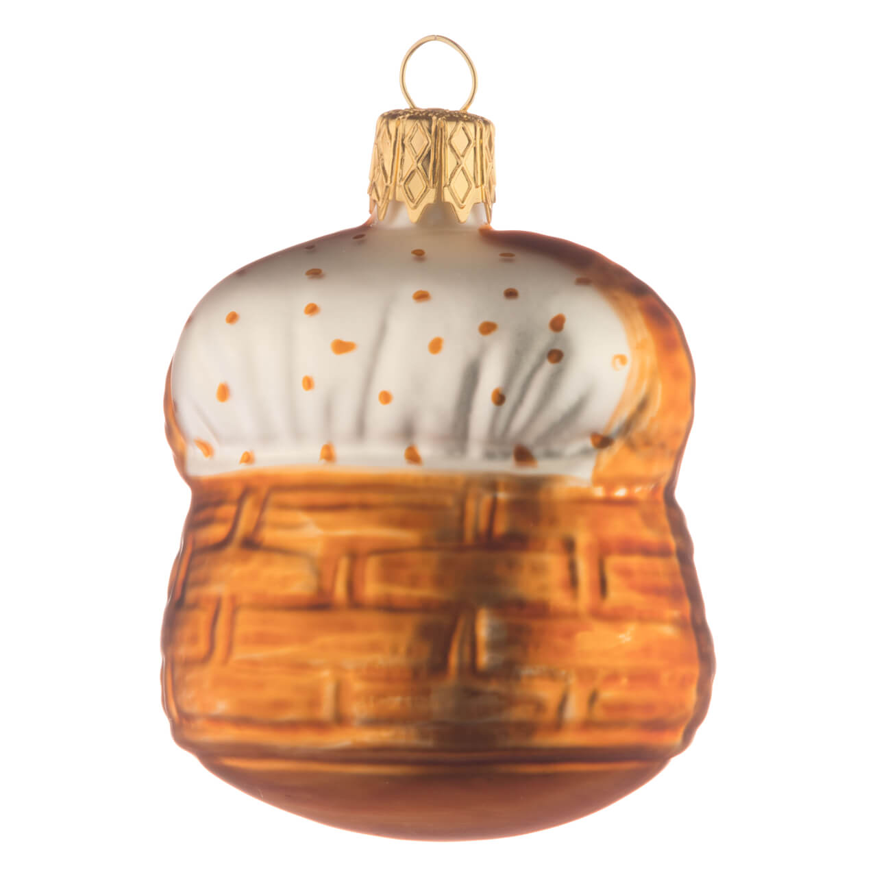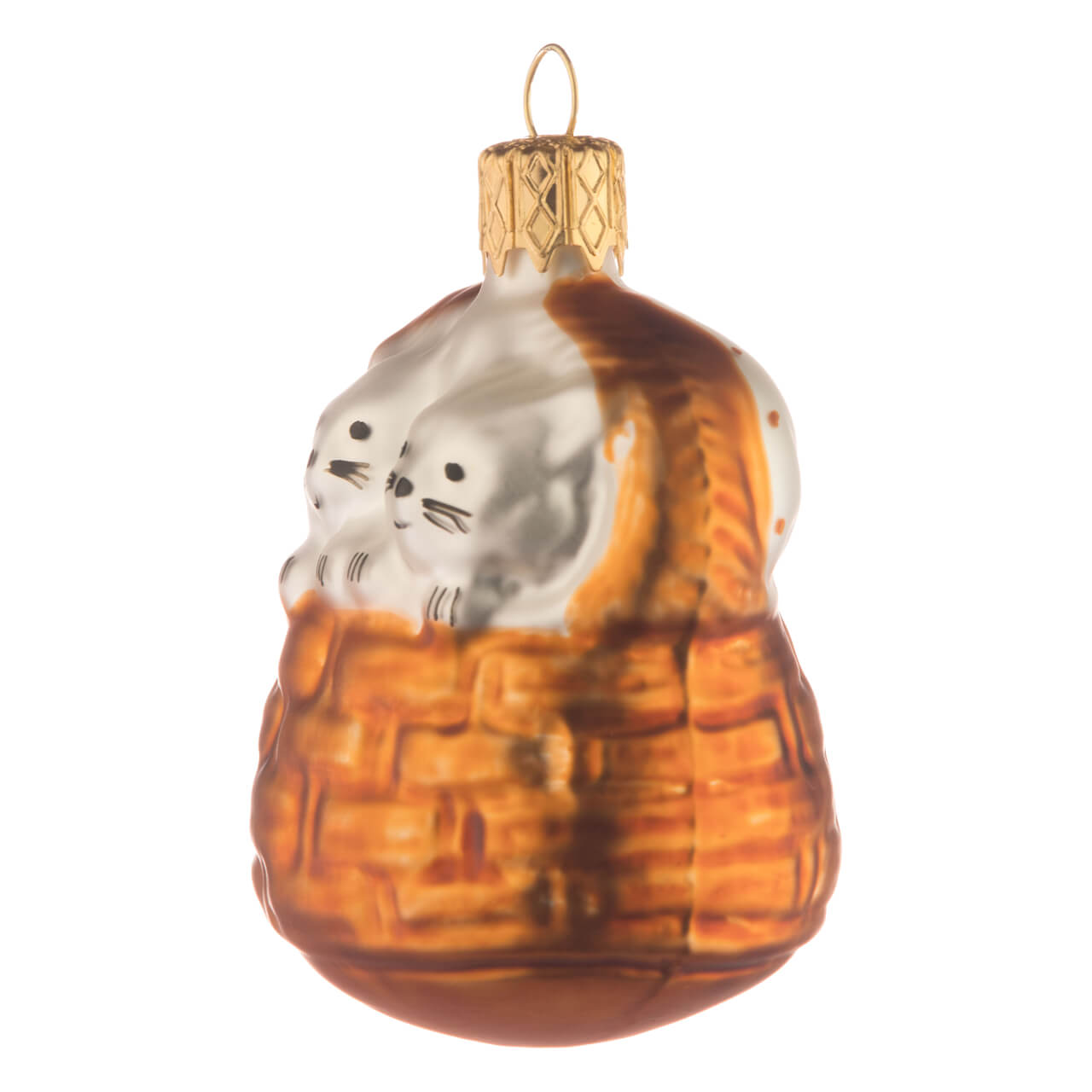 Zu niedlich ist diese auf den ersten Blick vielleicht nahezu unscheinbare Kugel auch gestaltet: Nähert man sich ihr von der Rückseite her, so lässt sich noch gar nichts Großartiges erahnen. Leuchtendbraun schimmert der oval geformte Korb mit seinem großen, flachen Henkel, auf dem das goldene Krönchen zur Befestigung thront. Der Inhalt? Gut verborgen unter einer matt weiß schimmernden Decke, auf die im gleichen Braunton kleine Pünktchen liebevoll aufgetupft wurden! Begibt man sich dann doch zur Vorderseite ... schauen sie einem prompt und neugierig entgegen: Zwei kleine Katzenbabys mit seidenweißem Fell, süßen Gesichtchen samt Schnäuzchen und Schnurrhaaren und kleinen, zarten Krallen an den Pfötchen, mit denen die beiden Kleinen sich am Korbrand festhalten.