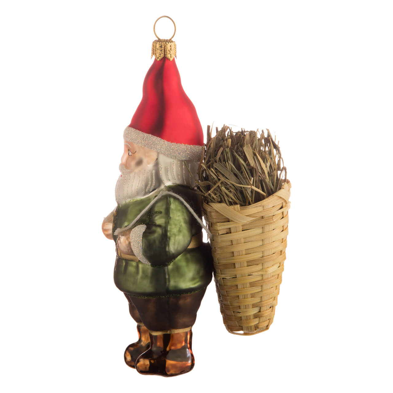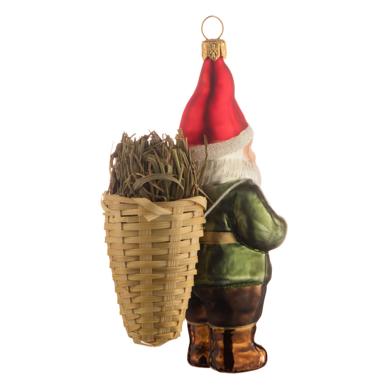 Auch die Gesichtsgestaltung zeugt von gleicher Sorgfalt, denn weiß beglittert und schwungvoll wie zart wurden Augenbrauen, Schnauz- und Vollbart herrlich umgesetzt. Weiß glitzernde dicke Krempen am Mützenrand und den Armmanschetten lassen frostige Wintergrade erahnen. Fehlt noch die Kiepe, die das Zwerglein stolz und stark auf seinem Rücken trägt: Ein echter, handgeflochtener, kleiner Korb mit Stroh gefüllt und Tragebändern, die bis zu den Händen reichen, ist die Last, die das Männchen hievt. Für sicheren Halt sorgt spezieller Kleber, mit dem dass rustikale Accessoire sorgsam an die Glasfigur geleimt wurde.