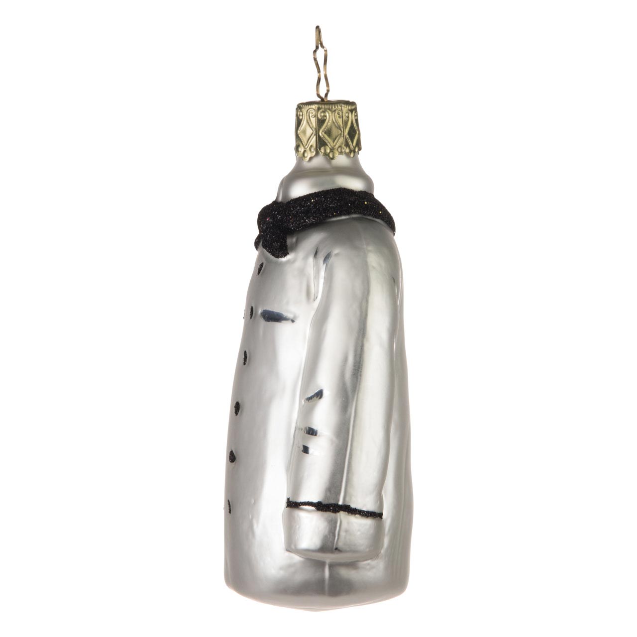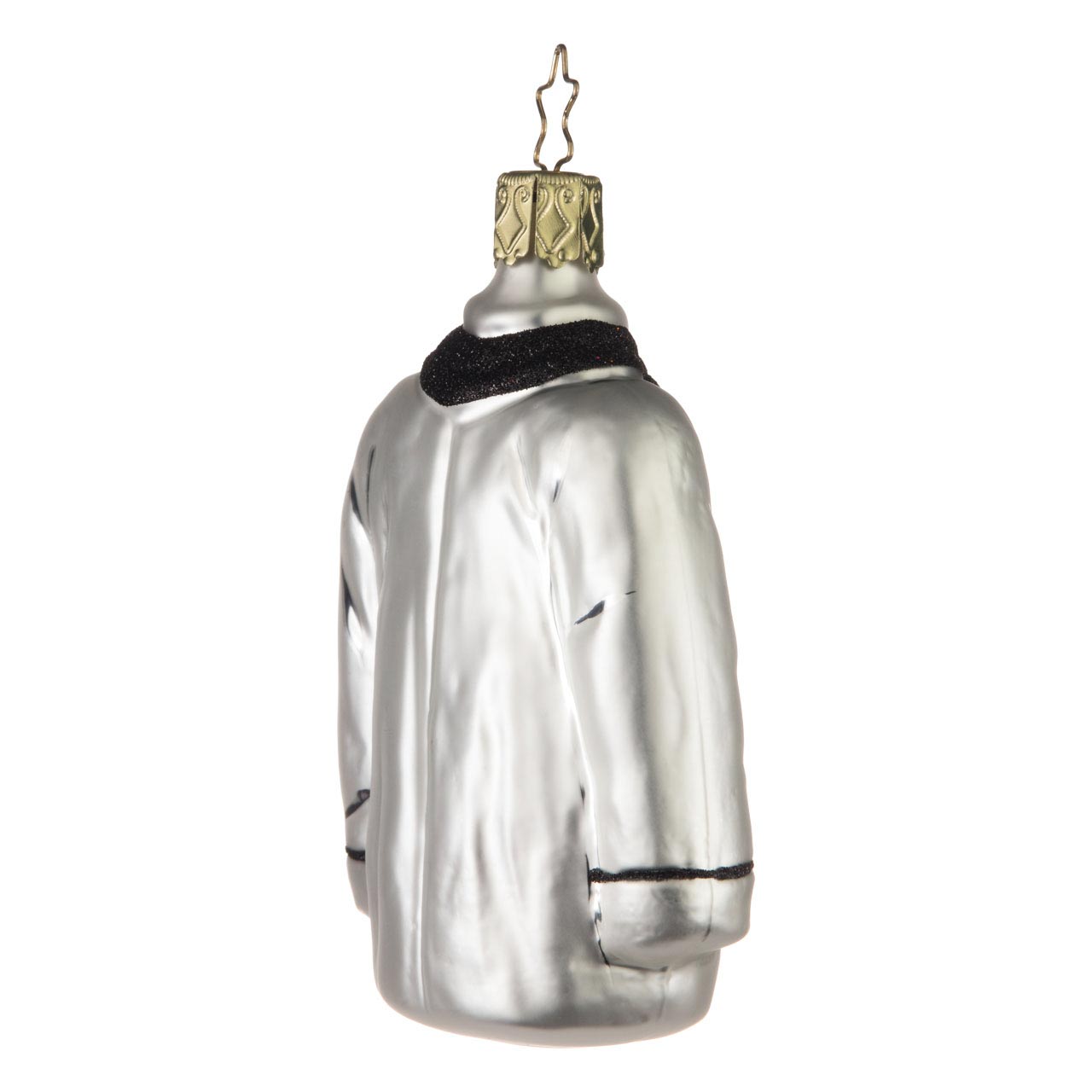 Und wie lautet das Rezept? Hinein mit der Figur an den Tannenbaum! Die matt weiß schimmernde Jacke mit den schwarzen Glitzerknöpfen und schwarzen Paspeln an den umgeschlagenen Ärmeln ist herrlich schlicht und durch ihre helle Farbe auffällig zugleich. Besonderes Highlight: das typische, geknotete, schwarz beglitzerte Tuch um die Halsöffnung.