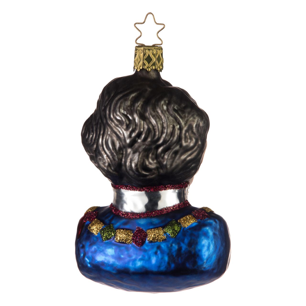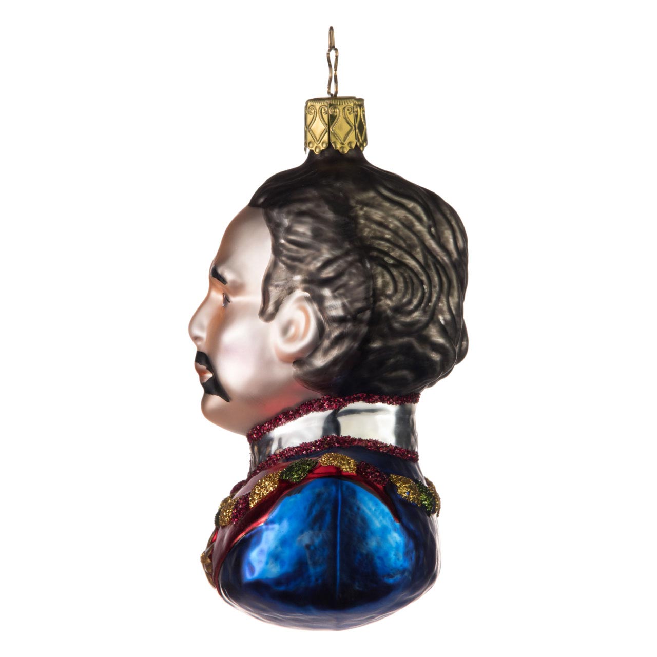 Höchste Zeit, dem begeisterten Förderer von Kultur und Bauästhetik selbst ein Denkmal zu errichten - und zwar in Form einer kleinen, feinen Büste für den Tannenbaum. Glänzend natürlich, die königliche Uniformjacke in blau, die obligatorische Schärpe in purpurnem Rot. Golden, rot wie grün beglitzert funkelt die majestätische Kette mit goldenem Stern auf der Brust. Und auch das Gesicht beeindruckt durch filigran gemalte Augen sowie den typischen, akkurat rasierten Bart. Nicht zu vergessen: die braune, leicht geschwungene Haarpracht, die Ludwigs Haupt umspielt.