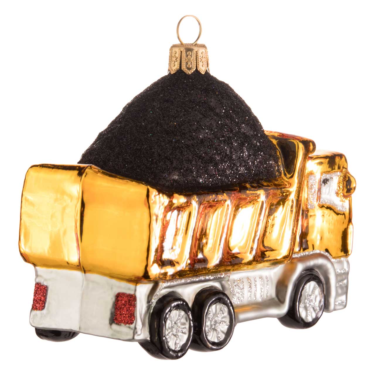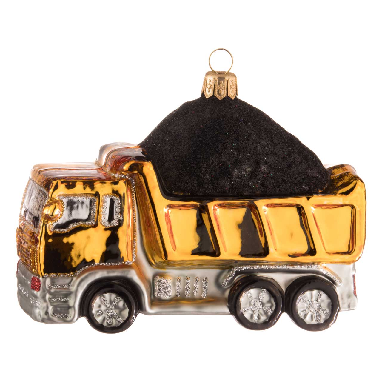 Ein Lastkraftwagen, kurz LKW, kann eine Menge transportieren - ob Kies, einen Container voller Turnschuhe oder den ganzen Hausstand einer vierköpfigen Familie. Dieses güldene Modell für den Tannenbaum transportiert Blumenerde oder schwarze Kohle in seiner offenen Schüttlade.