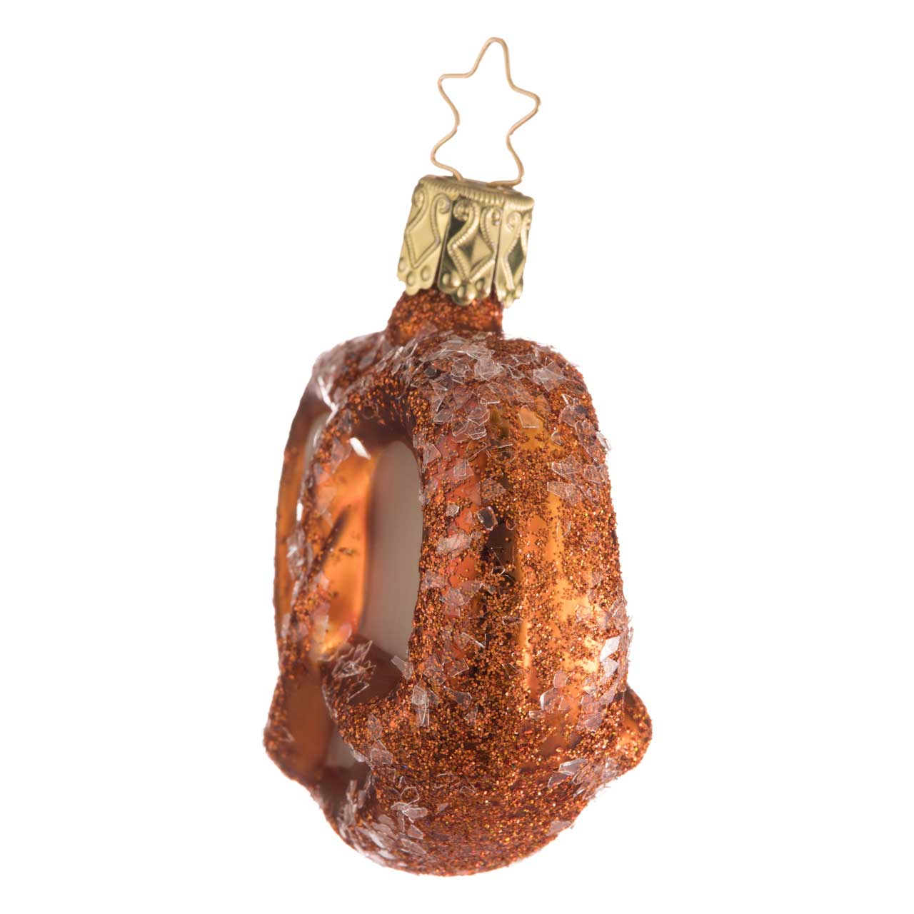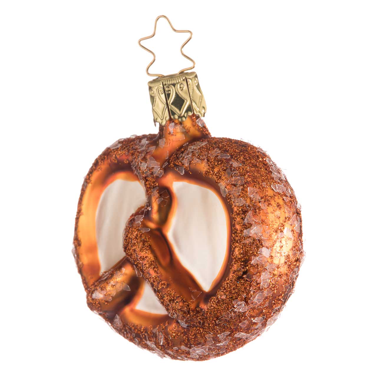 Braun gebrannt, mit braunem Glitter bestäubt sowie mit durchsichtigem Glitzergranulat verziert, das an Hagelsalzkörner erinnert, sieht die Brezel für den Baum lecker und nahezu festlich herausgeputzt aus. Die luftigen Lücken zwischen ihren geschwungenen Teigschnüren wurden übrigens baubedingt mit Glas verschlossen und dezent in einem matten, hellen Silberton lackiert.