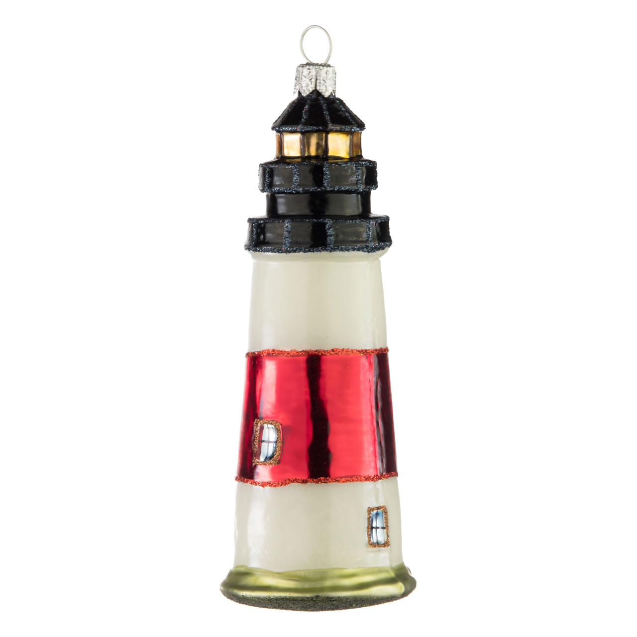 Der vorliegende Leuchtturm für den maritimen Weihnachtsbaum sieht ebenfalls ganz danach aus. Ein bisschen erinnert er mit seiner rot-weiß-schwarzen Färbung an den berühmten Turm von Westerheversand auf der schleswig-holsteinischen Halbinsel Eiderstedt. Rund wie ein Kegel ist er nämlich gebaut und mit dicken, markanten Blockstreifen versehen. Die Dachaufbauten mit dem goldbraun schimmernden Fensterkranz für die Lichtsignale glänzen in edlem Schwarz, dessen Falze zusätzlich mit schwarz glitzernden Konturen verziert wurden. Auch die wenigen sonstigen Fenster des Turms wurden mit akkuratem Pinselstrich aufgemalt und glitzrig eingefasst. Besonders passend: Der dünne Sockel, der den Fuß des Bauwerks bildet und von unten mit festlichem Glitter bestäubt wurde, schimmert matt in einem hellen Marschwiesengrün.