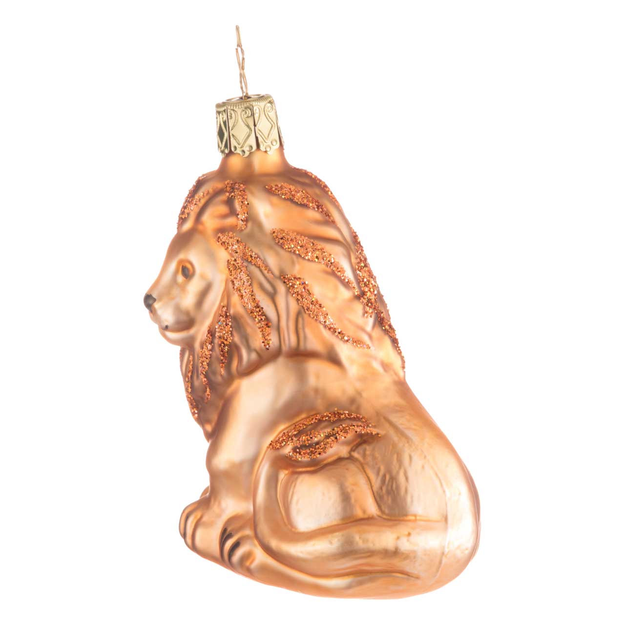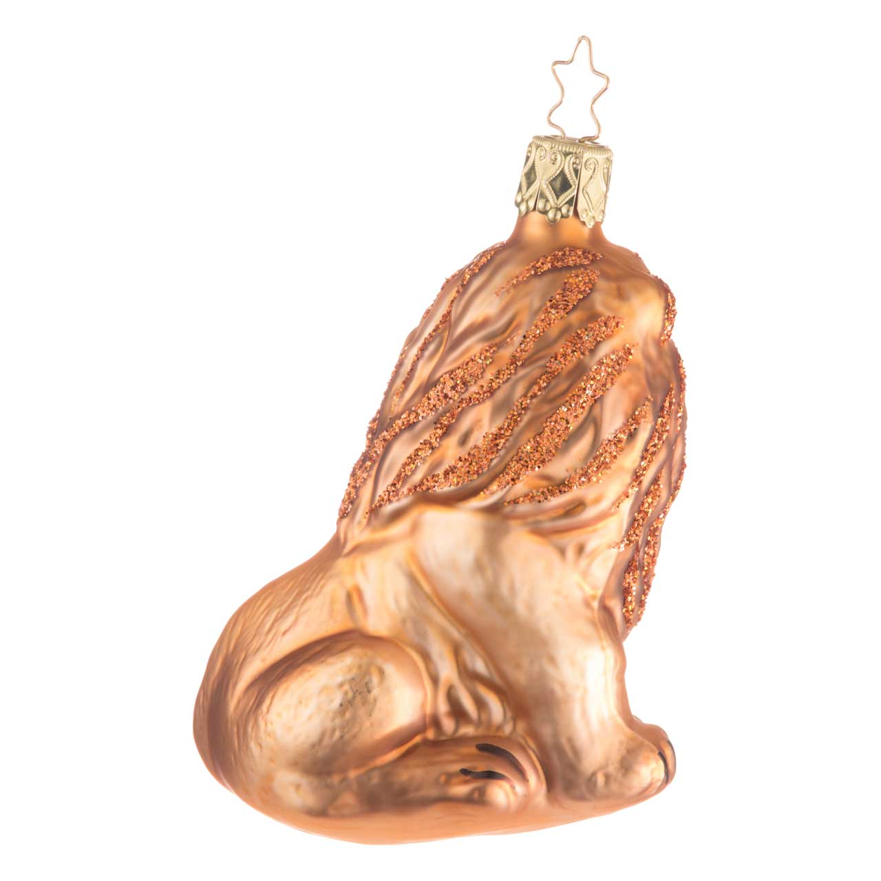 Eine prachtvolle Mähne rahmt das Haupt, dessen Augen und Schnauze mit sicherem Pinselstrich gezogen wurden. Orangebraun schimmert das seidige Fell. Nur in Mähne und an der Schweifspitze sorgt etwas Glitter für glamouröse Momente. Fast wie ein Wappentier sieht er aus: der Löwe für den Weihnachtsbaum.
