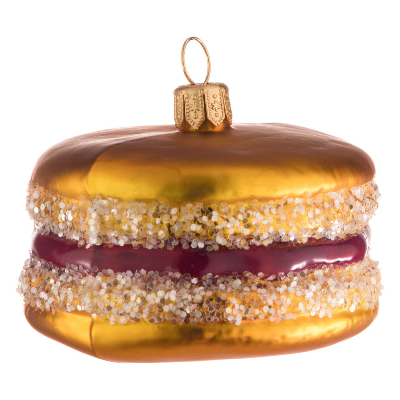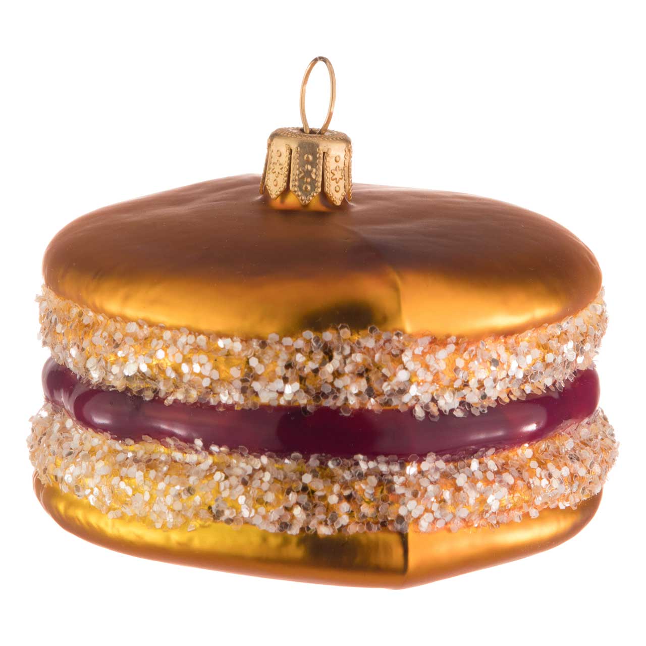Es gibt sie in zahlreichen Farben und Geschmacksrichtungen: die Macarons - süße, kleine französische Baiser-Gebäcke mit köstlicher Creme-Füllung. Als Schmuck für den Tannenbaum kommt hier ein prachtvolles Exemplar der Sorte Kirsch-Karamell daher, denn mit diesen Worten ist die kunstvolle Glasfigur wohl am besten zu beschreiben.