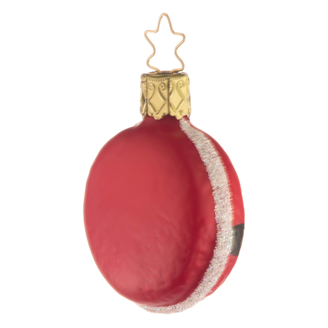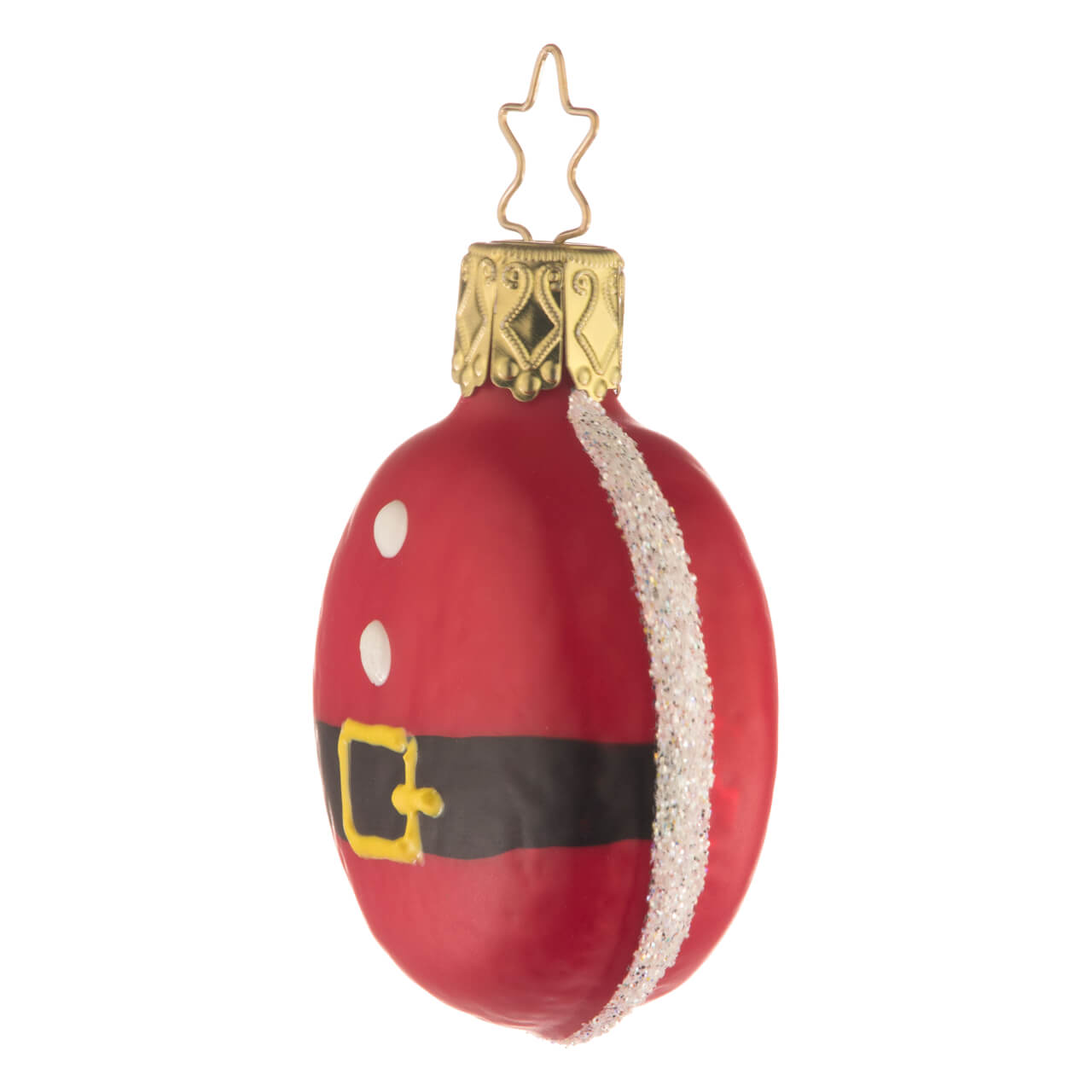 Einfach und dennoch höchst wirkungsvoll wurden zudem mit sorgfältigem Pinselstrich drei Details aufgetragen: Zwei weiße Punkte, ein breiter, schwarzer Strich und ein gelbes Viereck mit Strich darauf. Ganz klar: Wunderbar stilisiert erkennt jeder sofort die Front von Santas Weihnachtsmannjacke mit weißen Knöpfen und einem Gürtel mit breiter Schnalle. Und ganz wie bei einem echten Mantel, so wurde das Macaron auch nur auf der Vorderseite verziert. Die Rückseite präsentiert sich komplett in schlichtem Rot.