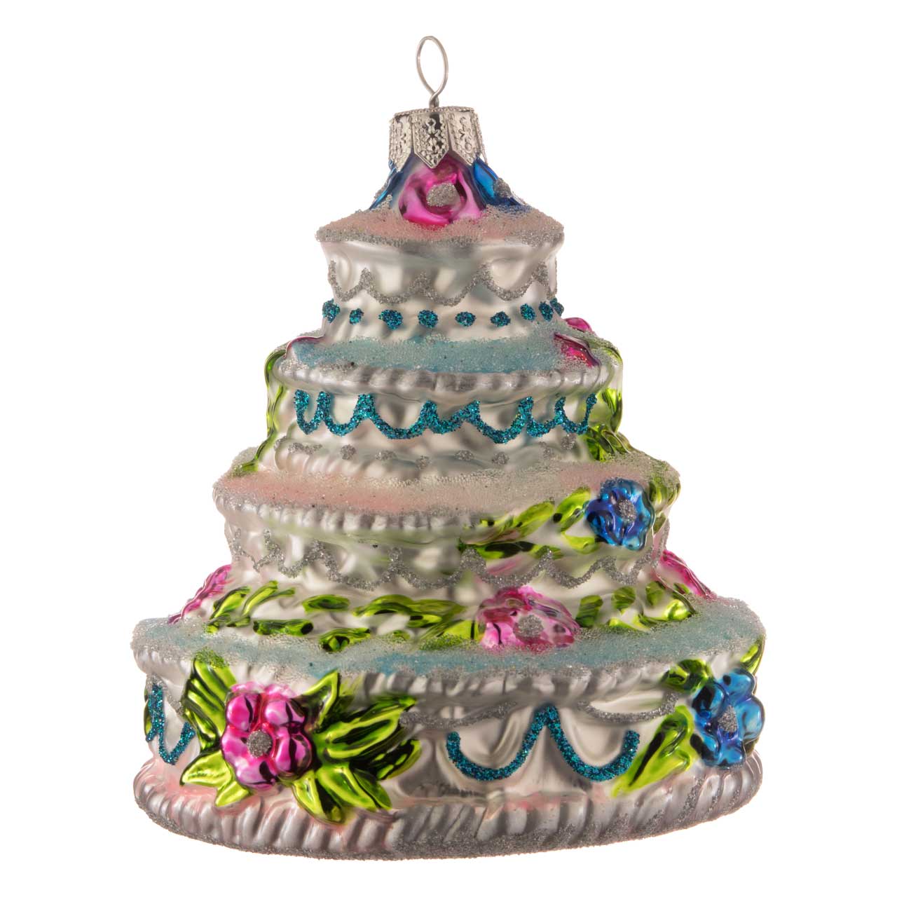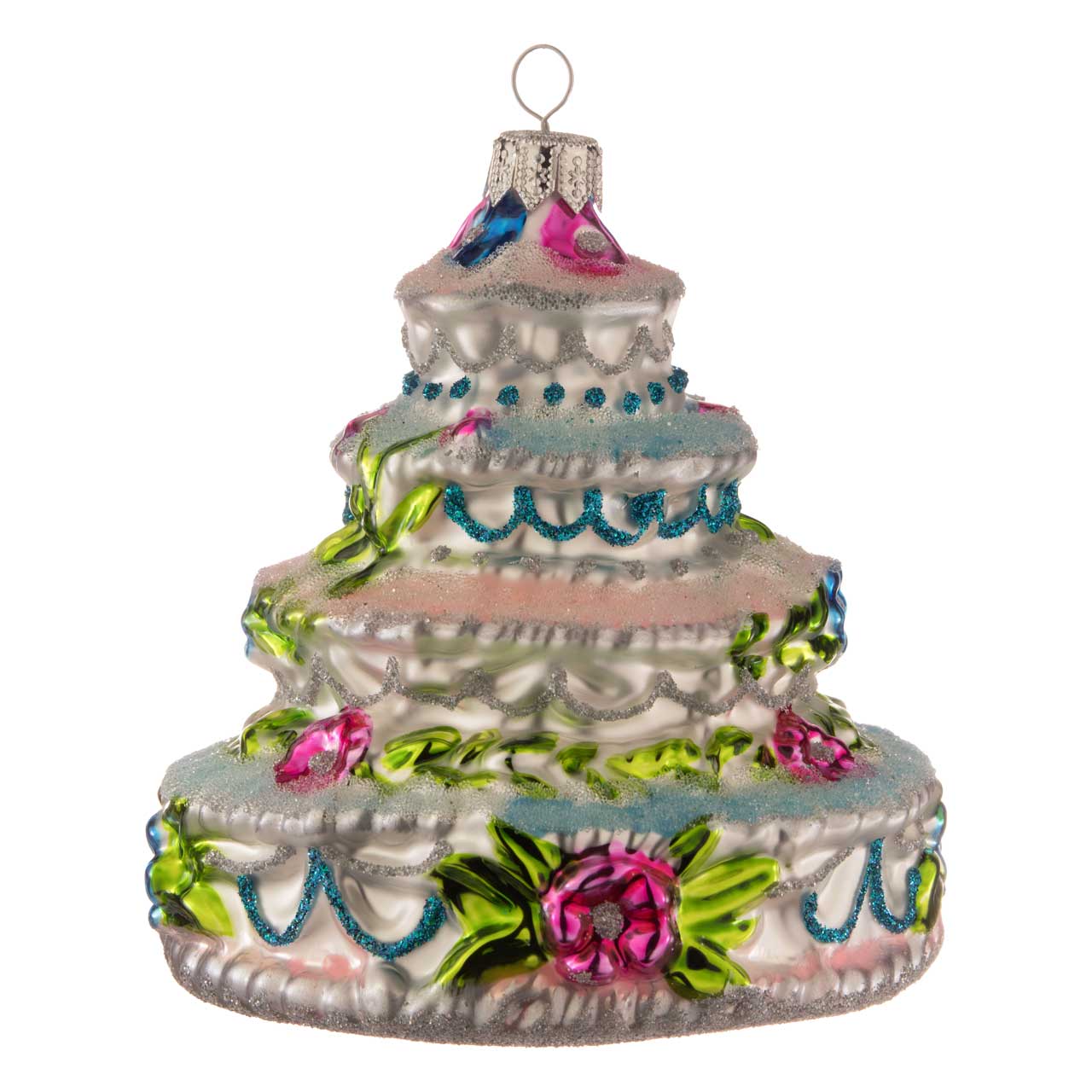 Wie mit weißem Fondant überzogen, so präsentiert sich die Basis matt schimmernd als neutraler, edler Untergrund. Kordeln und Girlanden schmücken schon in der Oberfläche erhaben das Meisterwerk. Rosafarbene und blaue, glänzende Blüten prangen hier und da am Tortenrand, jeweils umgeben von frischem, grünen Blattwerk. Glitzerlinien, -oberflächen sowie Punkte in den Farben Silber, Rosa und Blau verleihen dem süßen Kunstwerk zusätzlichen Glamour.