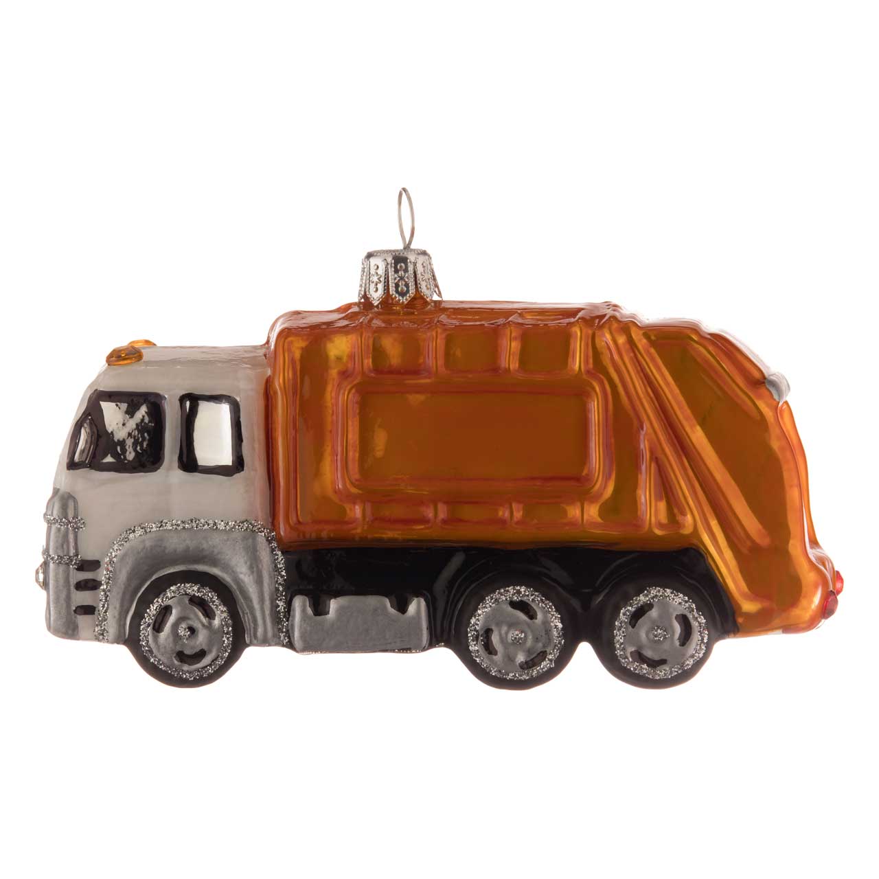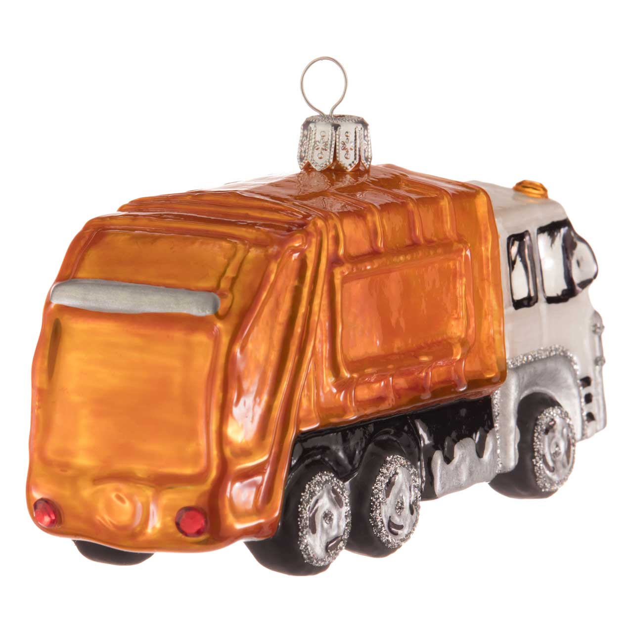 Lastwagen-Fans mit einem Faible für Spezialfahrzeuge werden sich vermutlich genauso über dieses regelrecht hübsche Müllauto für den Tannenbaum freuen wie Umweltaktivisten, die sich mit dem herausfordernden Thema intensiv auseinandersetzen. Ohne jegliche Beschriftung, dafür aber umso klarer in ihrer einfachen Symbolik präsentiert sich die Müllabfuhr als Weihnachtsschmuck: mit glänzend weißem Führerhäuschen, silbernen, spiegelnden Fenstern, einem schwarzen Chassee, schwarzen Reifen, silbernen Felgen, schwarzen und silbernen Glitterkonturen sowie mit dem charakteristischen Müllcontainer-Aufbau als Auflieger in leuchtendem Orange.