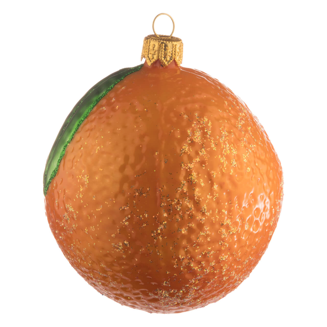 Und dennoch ist sie gleichzeitig ein herrlicher Exot. Weil ihre Oberfläche eben genauso puckelig gestaltet wurde wie ihr natürliches Vorbild es vorgibt. Auch die Farbe, ein frisches Orange, das übrigens in glänzendem Lack aufgetragen wurde, zieht gleich die Blicke auf das beliebte Obst. Das grün gemalte, matt schimmernde Blatt mit den ebenfalls grünen Glitterkonturen sorgt für Witz und Frische. Orange-silbriger Glitterstaub auf der gesamten Frucht lässt sie wie leicht bezuckert wirken und macht den glamourösen Auftritt perfekt.