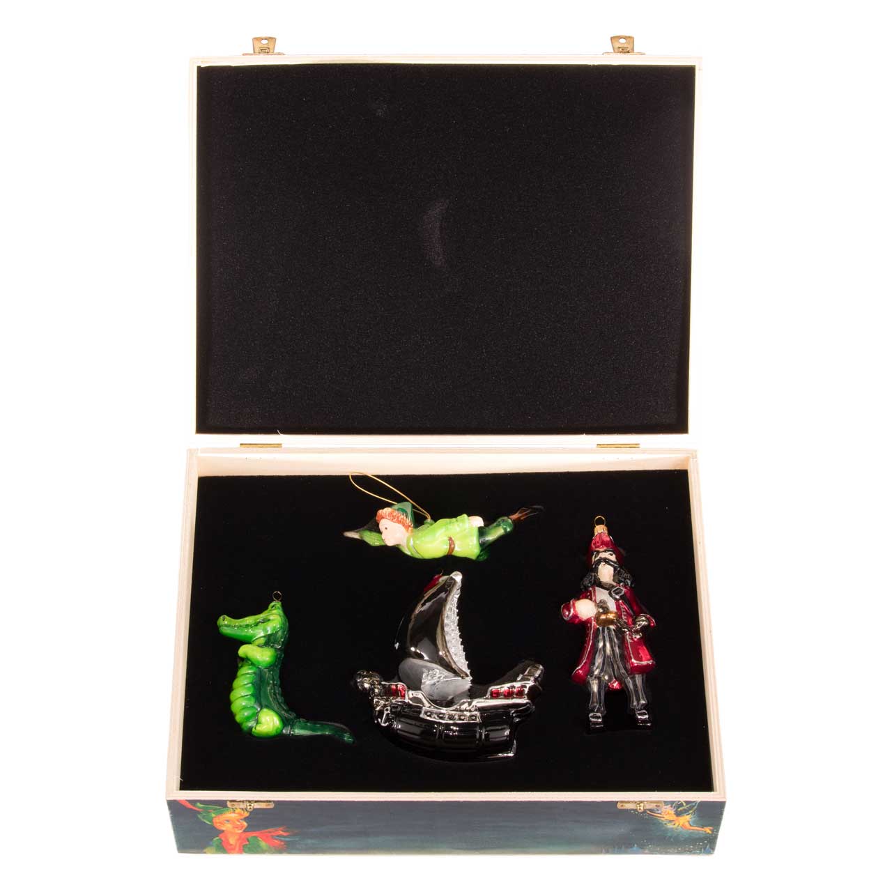 Sehr praktisch: Wie es sich für echte Schätze gehört, so kommen diese vier Figuren in einer kunstvoll bedruckten Sammler-Box aus Holz daher, deren Innenleben mit schwarzem Samtschaum jenseits der Weihnachtssaison den Glasanhängern einen sicheren Aufbewahrungsort bietet.