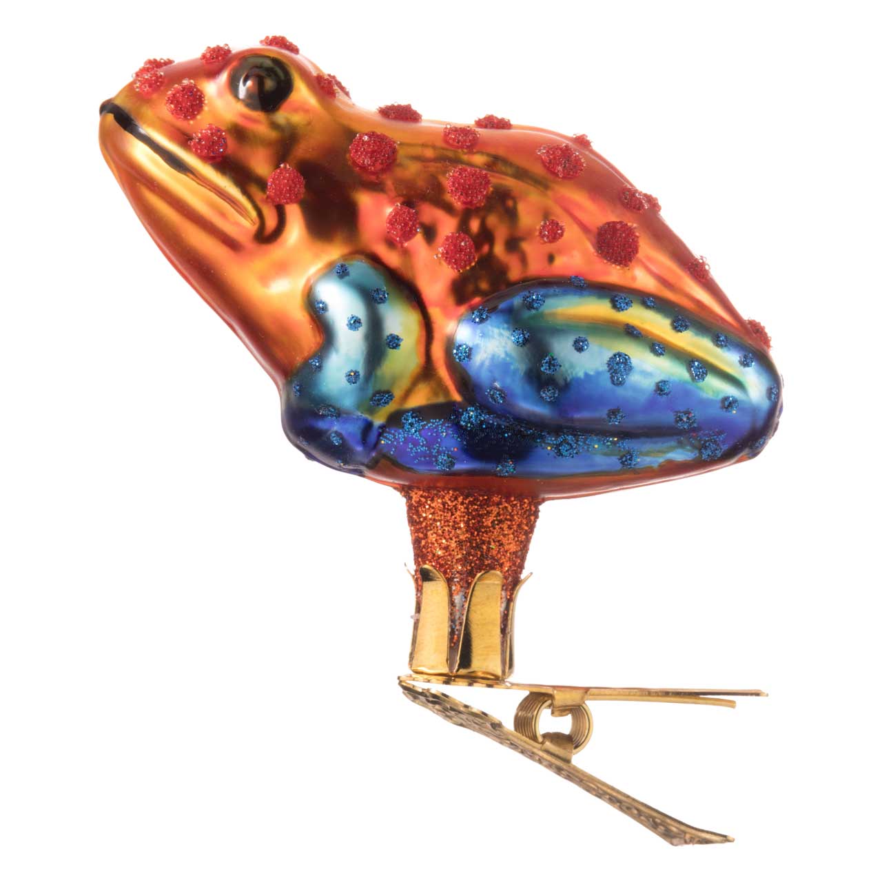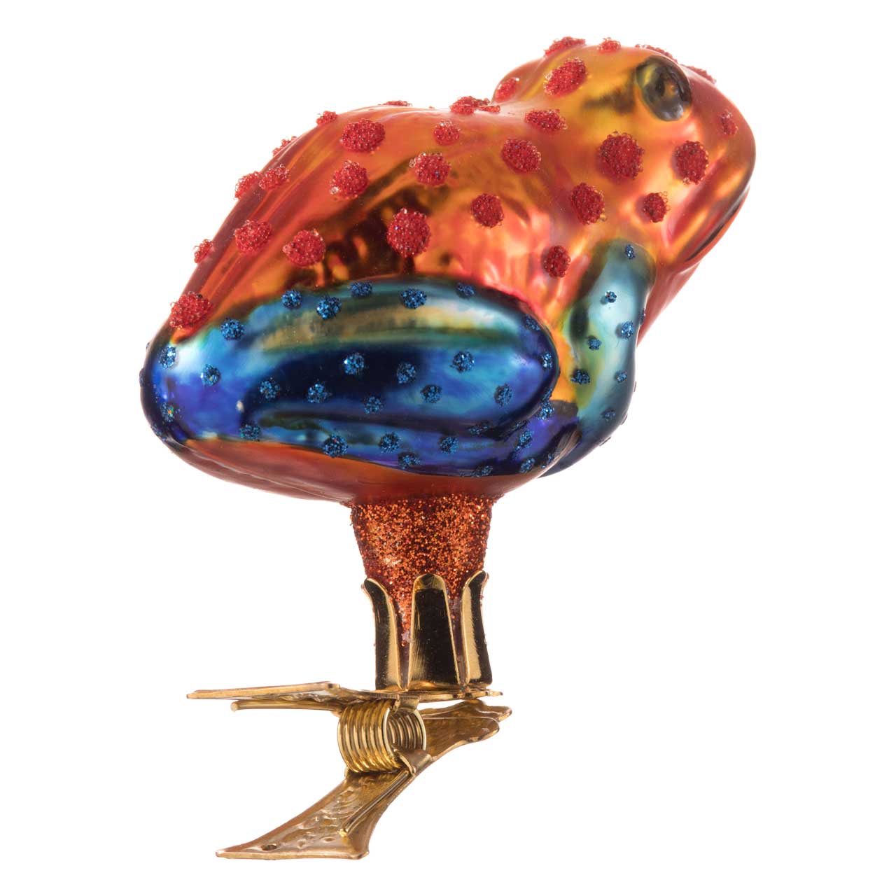 Auch als gläserne Deko am Christbaum macht die grelle Amphibie eine herrliche Figur. Auf einem goldenen Klipp thront sie nicht unter, sondern auf dem Tannenzweig - kunstvoll wie prächtig. In einem leuchtenden Orangeton schimmert der knubbelige Körper. Blaugrün bilden Arme wie Beine markante Kontraste. Mit sicherem Pinselstrich wurden die glubschigen Augen sowie das breite Maul aufgemalt. Farblich abgestimmte Glitzerpunkte in Rot und Türkis verleihen dem gefährlichen Frosch ein besonders artifizielles Äußeres.