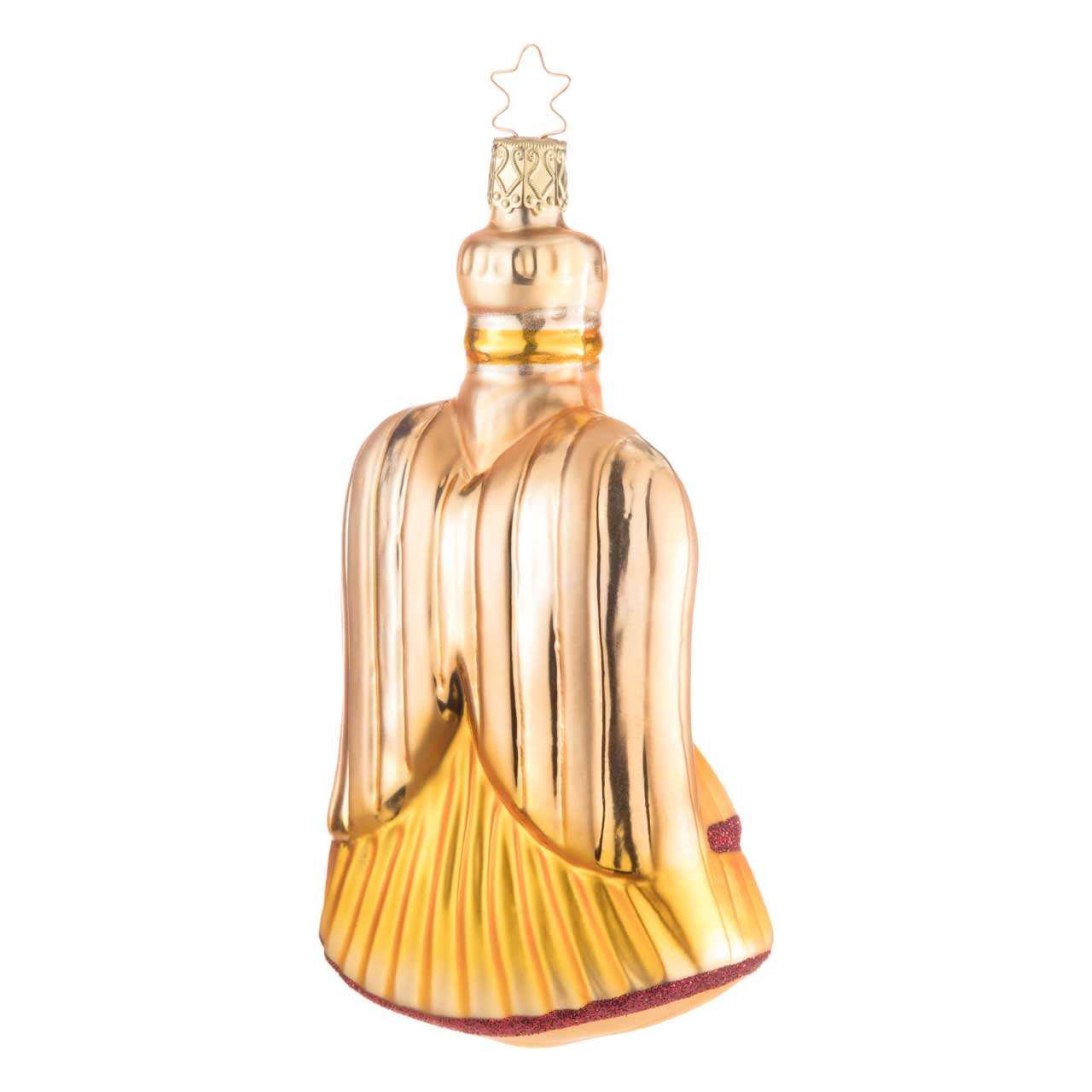 Ganz typisch ist sie geformt: Mit einem puppengleichen Figürchen im Zentrum mit matt rosafarbenem Gesicht und sorgfältig aufgetupften, blauen Augen nebst einem wohl geschwungenen Mund. Auf dem Haupt thront als Kopfbedeckung eine silbergoldene Krone mit Stern und hoher Füllung. In unterschiedlichen Gelbgoldtönen glänzt der gefächerte Rock, der mit rotem Glitter in zwei Ebenen untergliedert wurde. Senkrecht gestreifte, goldene Flügel runden das Erscheinungsbild majestätisch ab.
