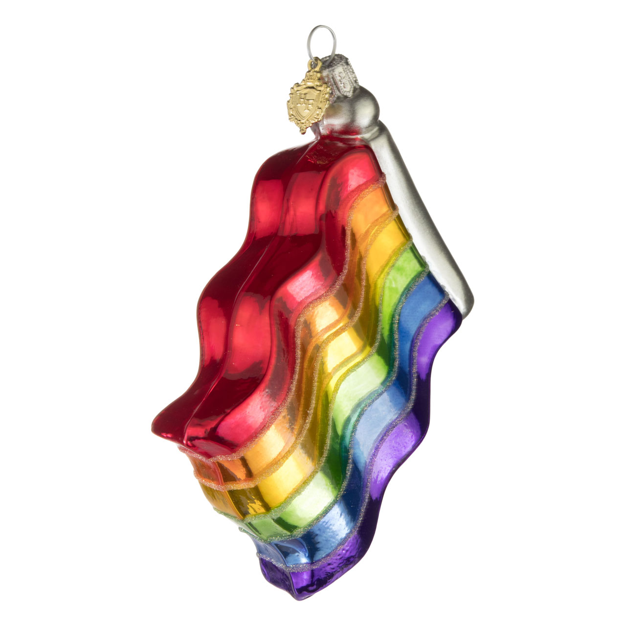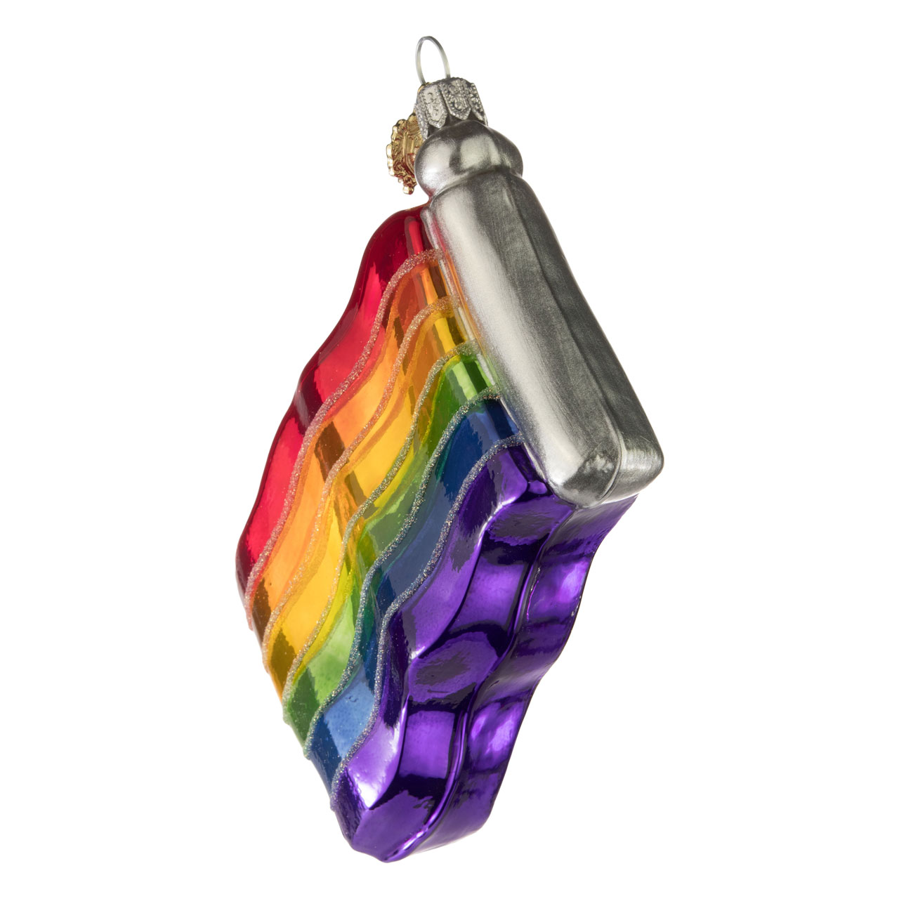 Als Flagge für den Tannenbaum kommt sie mit einer Dicke von rund 3cm verhältnismäßig massiv, unübersehbar und dennoch - aufgrund ihrer sanften Wellen - wie im Winde von silbernem Fahnenmast flatternd daher. Die Farben, von oben nach unten rot, orange, gelb, grün, blau und lila, glänzen festlich und werden durch weißliche Glitzerkonturen von einander getrennt.