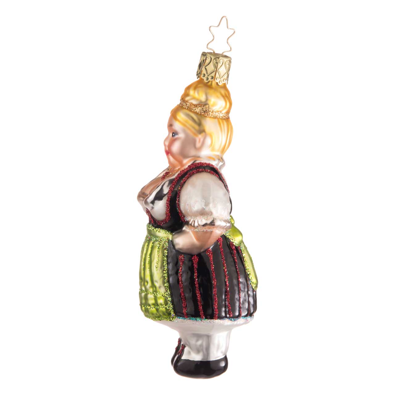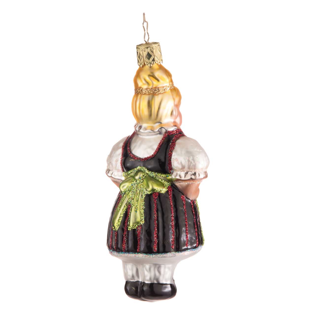 Die blonde Resi mit ihrem aufgetürmten Dutt auf dem Kopf, der weißen Bluse und dem schwarz-roten Dirndl mit hellgrüner Schürze kommt auf alle Fälle genau wie so eine geistige Alpenland-Schublade daher. Mollig präsentiert sie ihr üppiges Dekolleté, während sie selbstbewusst ihre Arme rechts und links in die Hüften stemmt. Silberweiße Strümpfe und schwarze Schuhe an den Füßen mit rot glitzernden Schnürsenkeln runden den gelungenen Auftritt ab.