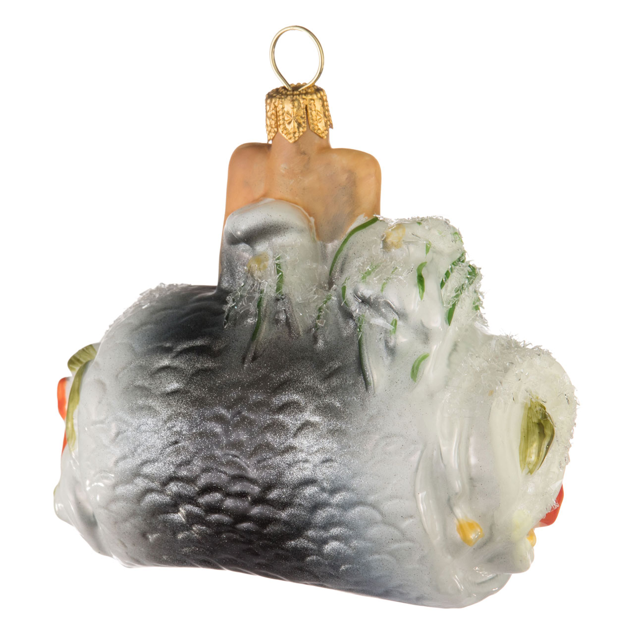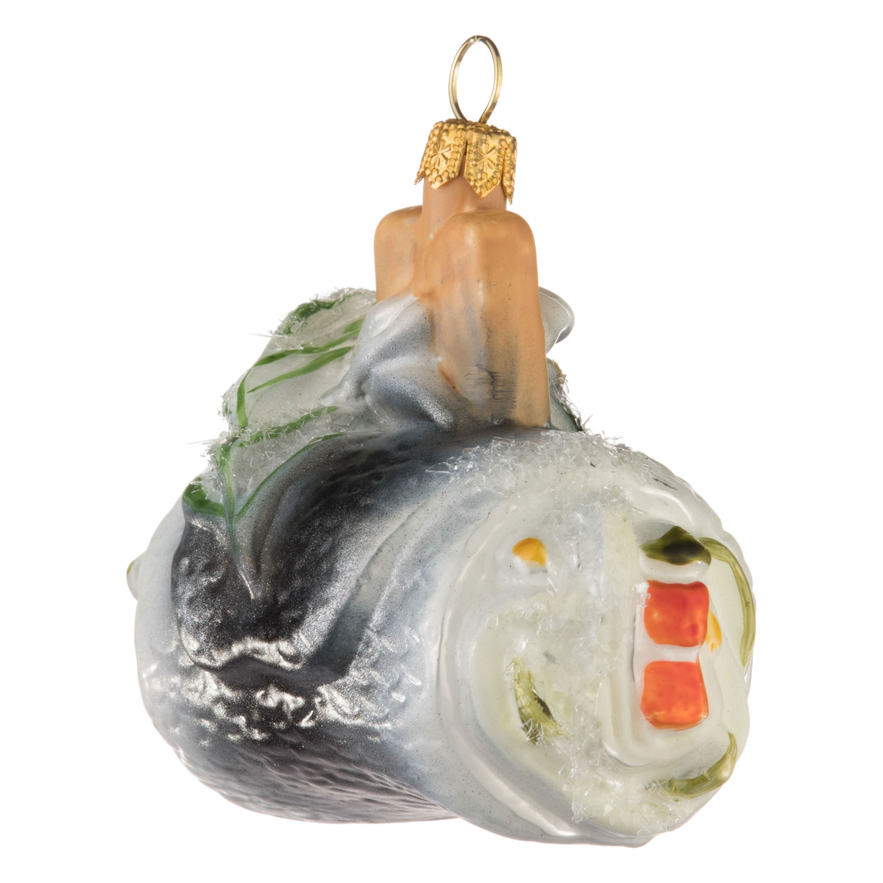 In kunstvoller, changierender Airbrush-Lackierung präsentiert sich der Hering wunderbar realistisch mit glänzender, schuppiger Fischhaut. An den Seiten der typischen Rolle lassen sich allerlei Leckereien erahnen: Ein wenig grün, ein bisschen gelb, aber auch rechteckige, möhrenorange Verzierungen verraten eindeutig, dass hier deutlich mehr als nur Zwiebeln und Gurke umwickelt wurden. Neben dem matt und holzbraun lackierten Holzstäbchen, das die maritime Delikatesse zusammenhält, prangt übrigens ein dekorativer, mit filigranem Pinselstrich nachgezogener, grüner Dillzweig. Und als käme das gute Stück direkt aus der geeisten Auslage, so wurde der Rollmops oben und an den Seiten mit durchsichtigen Glittersplittern raffiniert bestäubt.