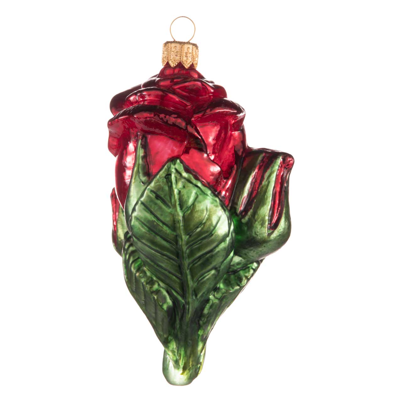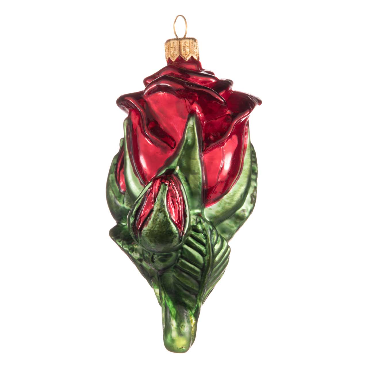 Sie ist nicht nur die Lieblingsblume vieler und ein echter Klassiker, wenn es um Blütengewächse geht. Die rote Rose steht auch als Symbol für Schönheit und Liebe. Am Weihnachtsbaum macht sie sich daher mit ihrer satten Farbe besonders gut. Voll, wohlgeformt und mit zwei weiteren, aufbrechenden Knospen kommt sie hier herrlich üppig wie naturalistisch daher.