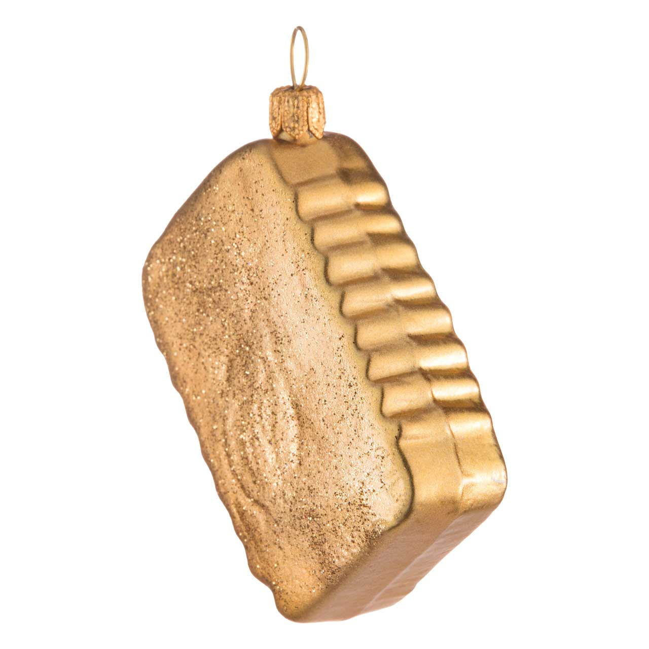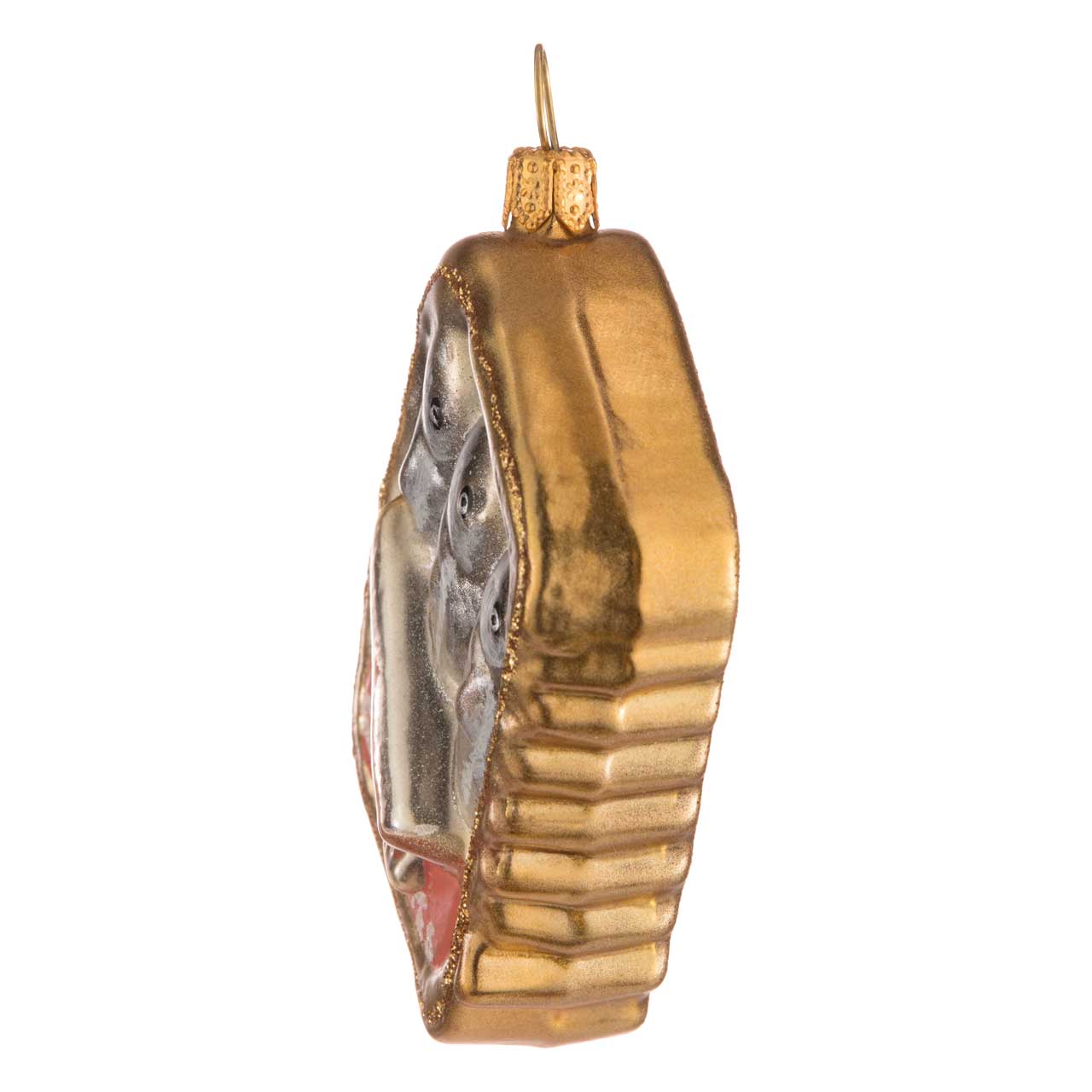 Ihre aus Glas geblasene, rechteckige Blechdose kommt dabei aber eigentlich ganz klassisch und regelrecht unauffällig daher. Goldfarben wurde sie lackiert, die flache Rückseite leicht golden beglitzert. Markant geriffelt präsentiert sich rechts und links der Rand. Ein rotes Etikett mit silbrig weißer Schrift sowie einem aufgemalten Fisch verrät unmissverständlich: "Sardinen" befinden sich in der Konserve. Und dank des halb geöffneten, aufgerollten Deckels kann man sie auch wahrhaft nebeneinander liegen sehen: Drei silberne Sardinen mit schwarz-weiß gemalten Äuglein und zartem Silberglitter auf der glänzenden Fischhaut.