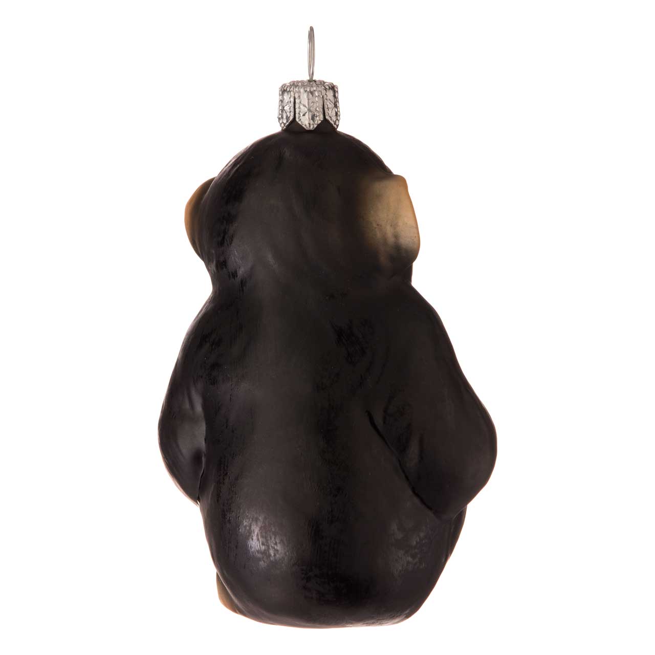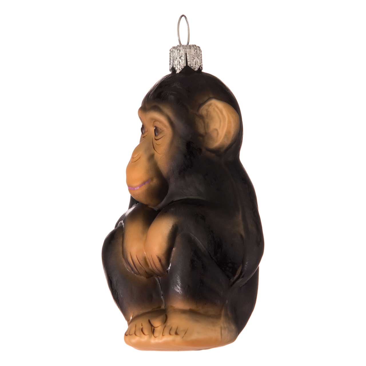 Abwartend sitzt er da, ein bisschen kauernd, ein bisschen hockend. Mit geduldig freundlichem Gesicht. Ob der kleine Schimpanse auf eine schmackhafte Banane wartet? Oder auf den Beginn der Bescherung? Ganz schlicht und still baumelt er dabei von seinem silbernen Krönchen herab.