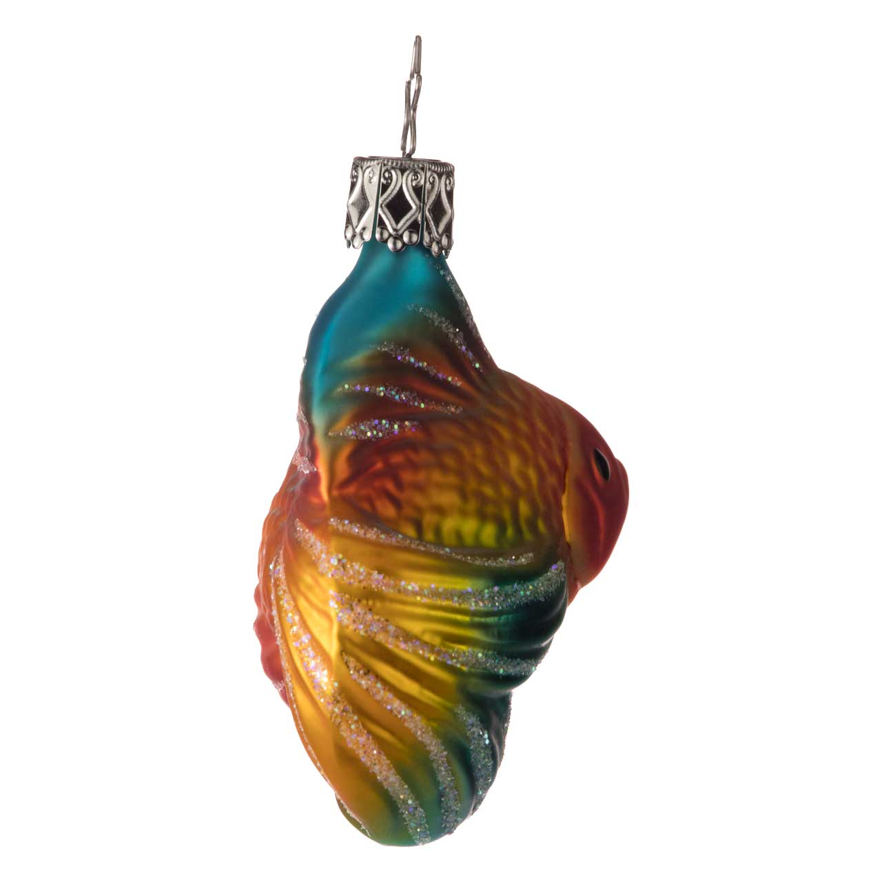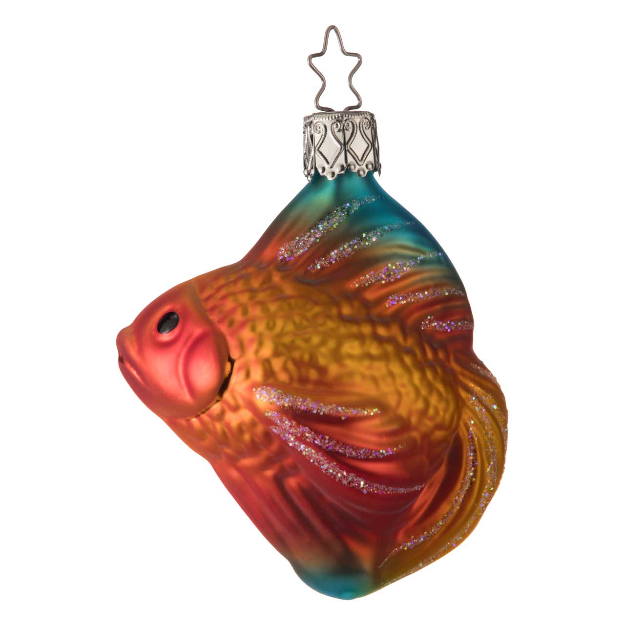 Fische im Weihnachtsbaum haben bereits eine lange Tradition. Dieser Schleierfisch vereint gleich beides in sich: das altbewährte Motiv mit modernster Färbetechnik und einer ungewöhnlichen, kunstvollen Form. Das Tier, das in natura ursprünglich als Goldfisch-Züchtung in China entstand, beeindruckt neben seiner käftigen, orange-roten Farbe nämlich auch mit seinen namensgebenden, gewaltigen Flossen.