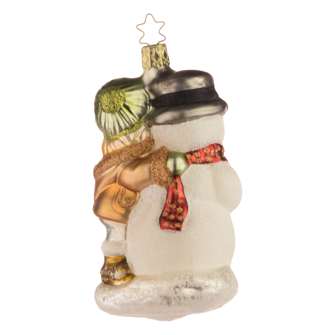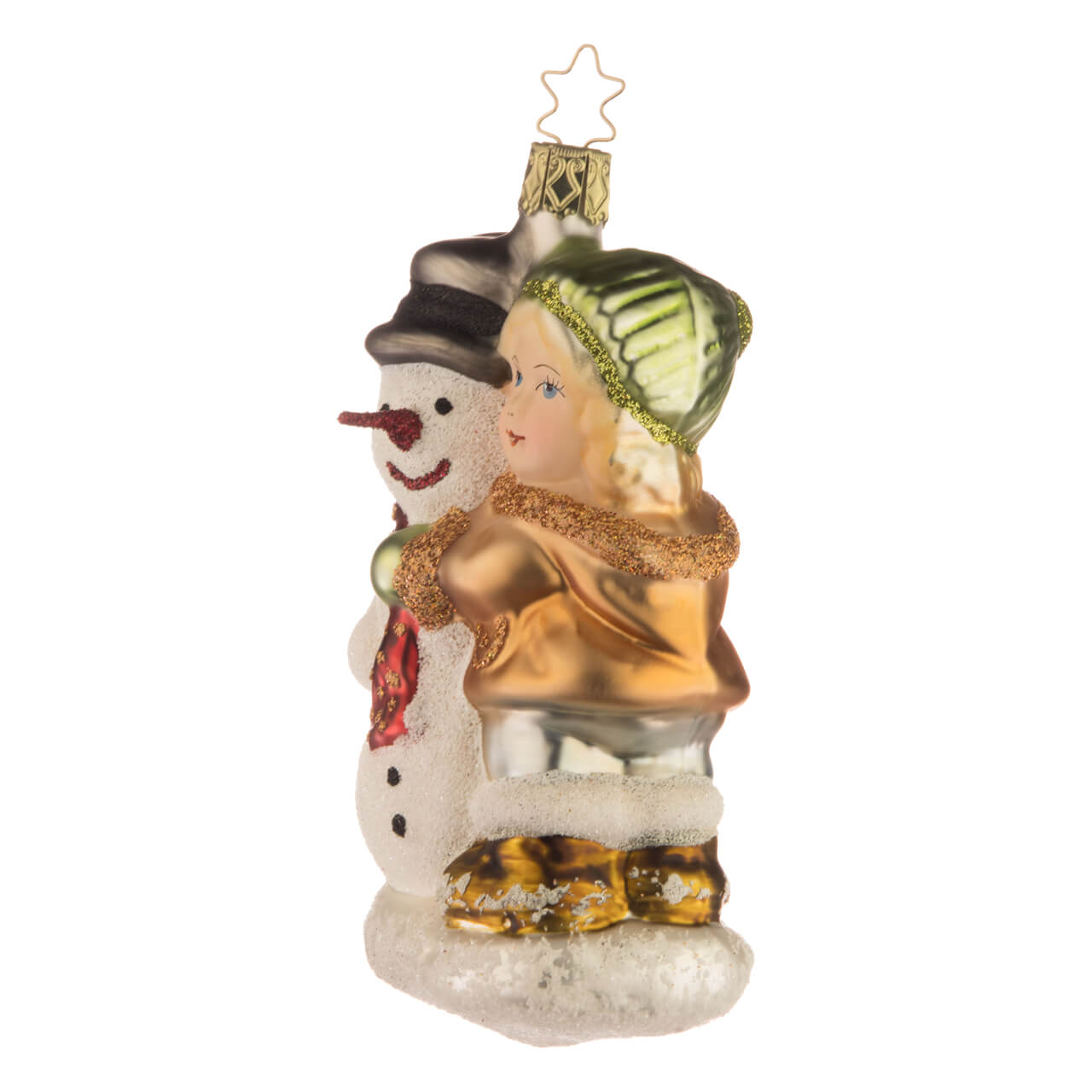 So wie dieses kunstvoll gestaltete Kind, das das Paradebeispiel eines Karottennasen-Trägers gebaut hat und ihm nahezu liebevoll den letzten Schliff verleiht. Eine lange, rot glitzernde Nase, schwarze Kohlenaugen und Knöpfe hat er bereits. Auf seinem Kopf thront ein silbergrauer Hut mit schwarz glitzerndem Band. Fehlt also nur noch der Schal; rot glänzend mit goldenen Glitzerpunkten. Auch der Schneemann selbst blitzt und blinkt weiß wie aus echtem Schnee geformt. Und auch das in nostalgisch matten Farben gewandte Kind, das zu einer grünen Mütze eine beigefarbene Jacke, eine hellgraue Hose und braune Stiefel kombiniert, wurde farblich abgestimmt mit jeder Menge Glitter bestäubt. Einzig das blonde Lockenhaar sowie das mit feinem Pinselstrich gemalte Puppengesicht besticht vor allem durch schlichte Akkuratesse.