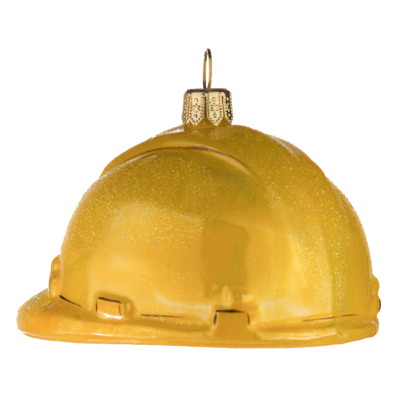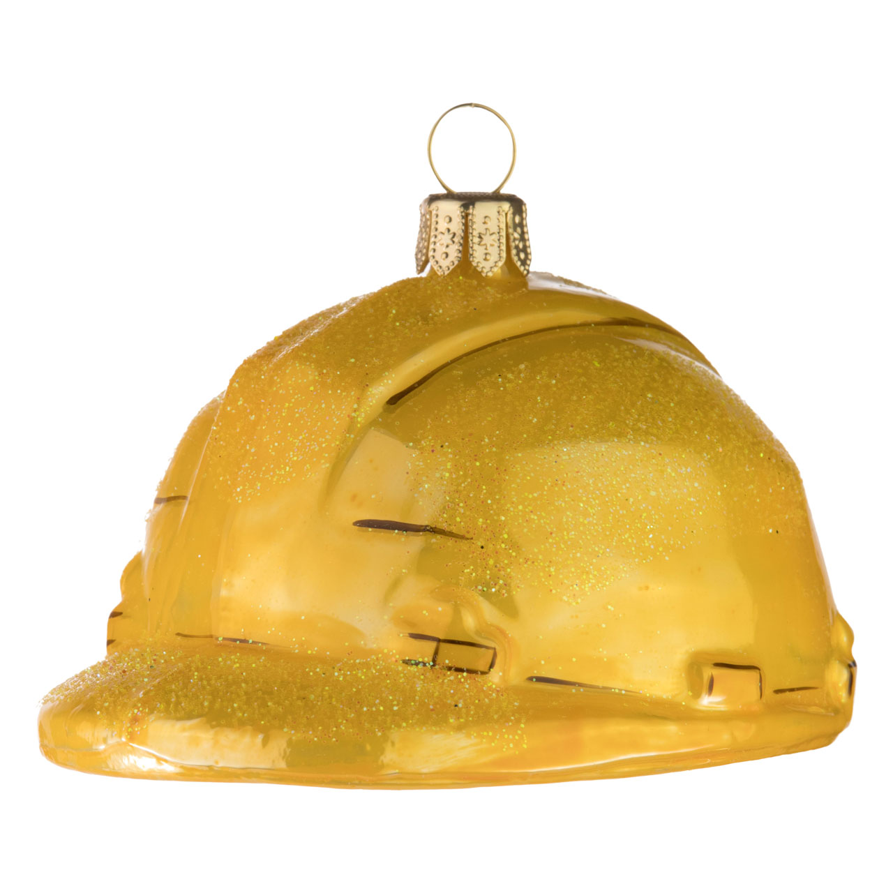 Was leuchtet denn dort so unübersehbar in Baustellen-gelb? Ein schmaler, schützender Schild in der Front, der Korpus oval gewölbt und noch dazu obenauf für eine bessere Stabilität mit einem breiten Streifen extra verstärkt? Ganz recht, die vorliegende Christbaumfigur ist als Schmuck für den Baum ziemlich ungewöhnlich, dafür aber ebenso unverkennbar: ein Schutzhelm, der wohl nicht nur Architektinnen und Bauarbeitern ein Lächeln auf die Lippen zaubern wird.