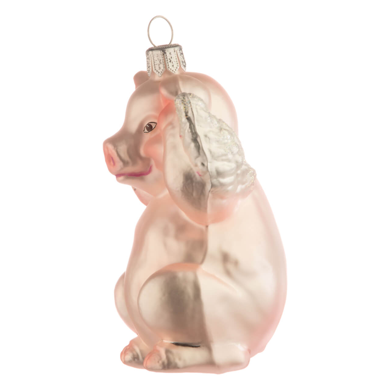 Oder wie würden sie das verschmitzte Grinsen beschreiben, das mit rosa gezogenem Pinselstrich die süße Schweineschnauze umspielt? Zum Dahinschmelzen! Entwaffnend sind dabei nicht nur die lustigen, munteren, braun-weißen Äuglein, sondern auch die herrlich nach oben gehaltenen Vorderpfötchen, mit denen es die rosigen Schweineohren berührt. Aufrecht, nahezu Männchen machend sitzt es zudem auf dem Po - in wahrer Jubelstimmung. Was es zu feiern gibt? Natürlich Weihnachten, denn passend zum Fest hat das drollige Tierchen sich mit ein paar silberweißen und ordentlich glitzernden Engelsflügeln ausstaffiert.