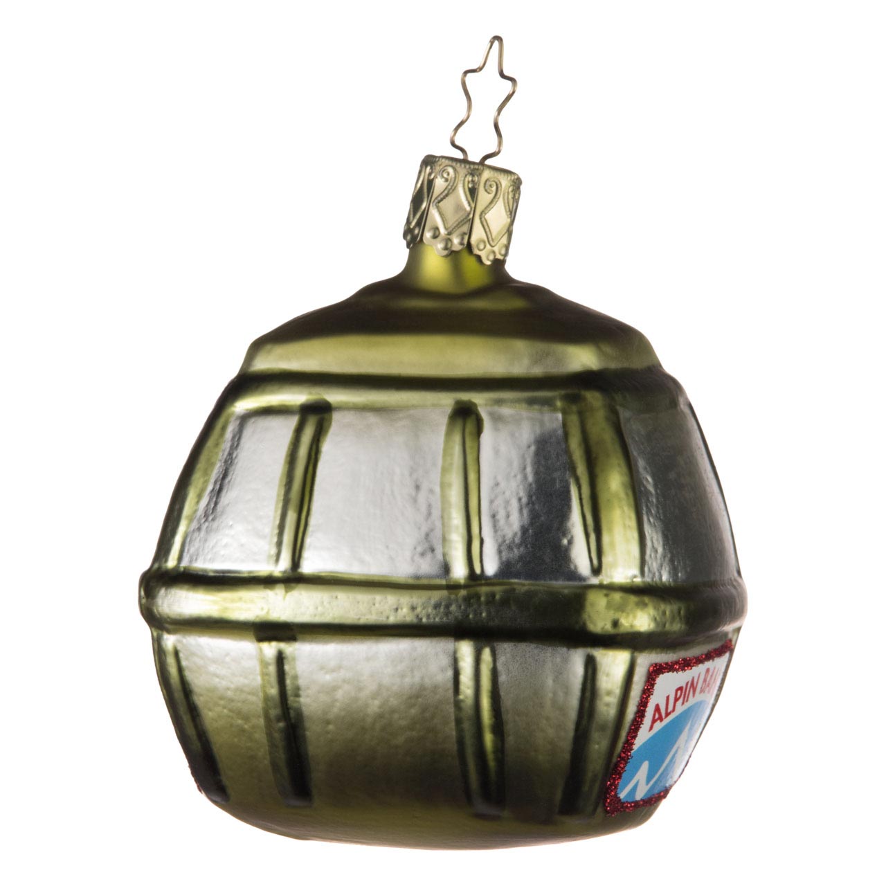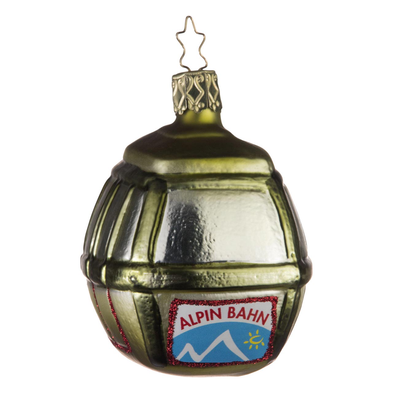 Denn auch wenn ihre Form nur dezent von der klassischen Christbaumkugel abweicht, so versprüht sie mit den silbern schillernden Fenstern, den waldgrünen Streben und Rahmen und dem wiesengrünen Rumpf jede Menge Urlaubsflair. Denn ob für sommerliche Wandertouren oder für die nächste Skiabfahrt - mit der Seilbahn geht es sommers wie winters bergauf. Besonders liebevolle Details: Die rot glitzernden Markierungen an den Türen sowie das touristisch anmutende Werbeschildchen mit den unmissverständlichen Lettern „Alpin Bahn“.