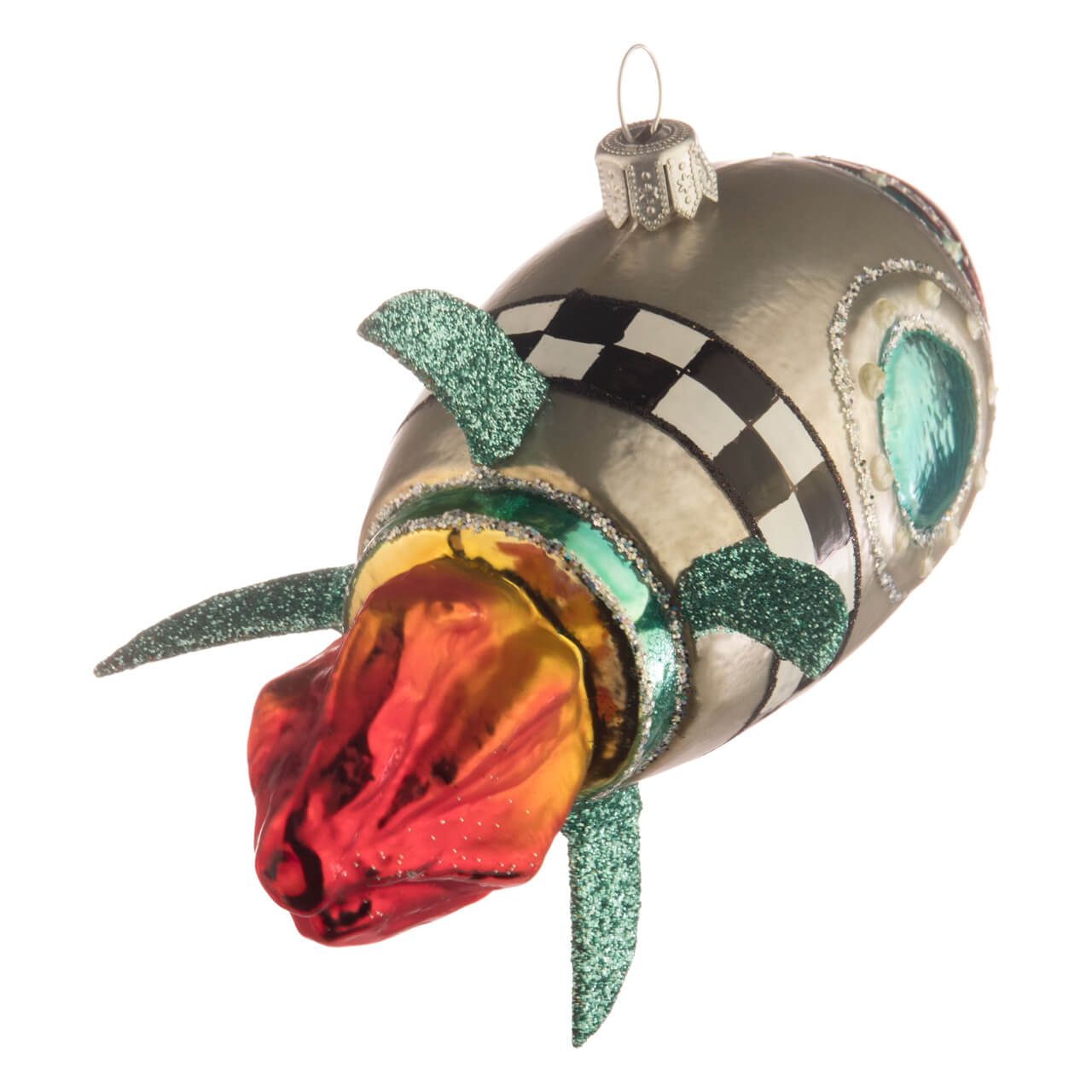 Wie aus der Spielzeugabteilung der Sechziger Jahre präsentiert sie sich glänzend in leuchtenden Farben. Der Hauptkorpus natürlich in metallischem Silber, die Spitze in knalligem Rot. Wasserblaue Streifen bilden trennende Konturen zur Spitze und zum Düsenantrieb. Auch die beiden kreisrunden Bullaugen wurden im bläulichen Ton lackiert. Eine schwarz-weiß gewaffelte Schachbrett-Banderole sorgt für spannende Kontraste. Weiße Pünktchen erinnern an Schrauben. Silbern glitzernde Konturen erzeugen festliche Akzente. Mit feurig rot-orange-lodernden Flammen scheint die Rakete in ungeahnte Ferne zu düsen. Die sorgsam aufgeklebten, flossenartigen Tragfüße, die wasserblau über und über mit Glitter verziert wurden, verleihen ihr dabei eine ganz besondere Windschnittigkeit.