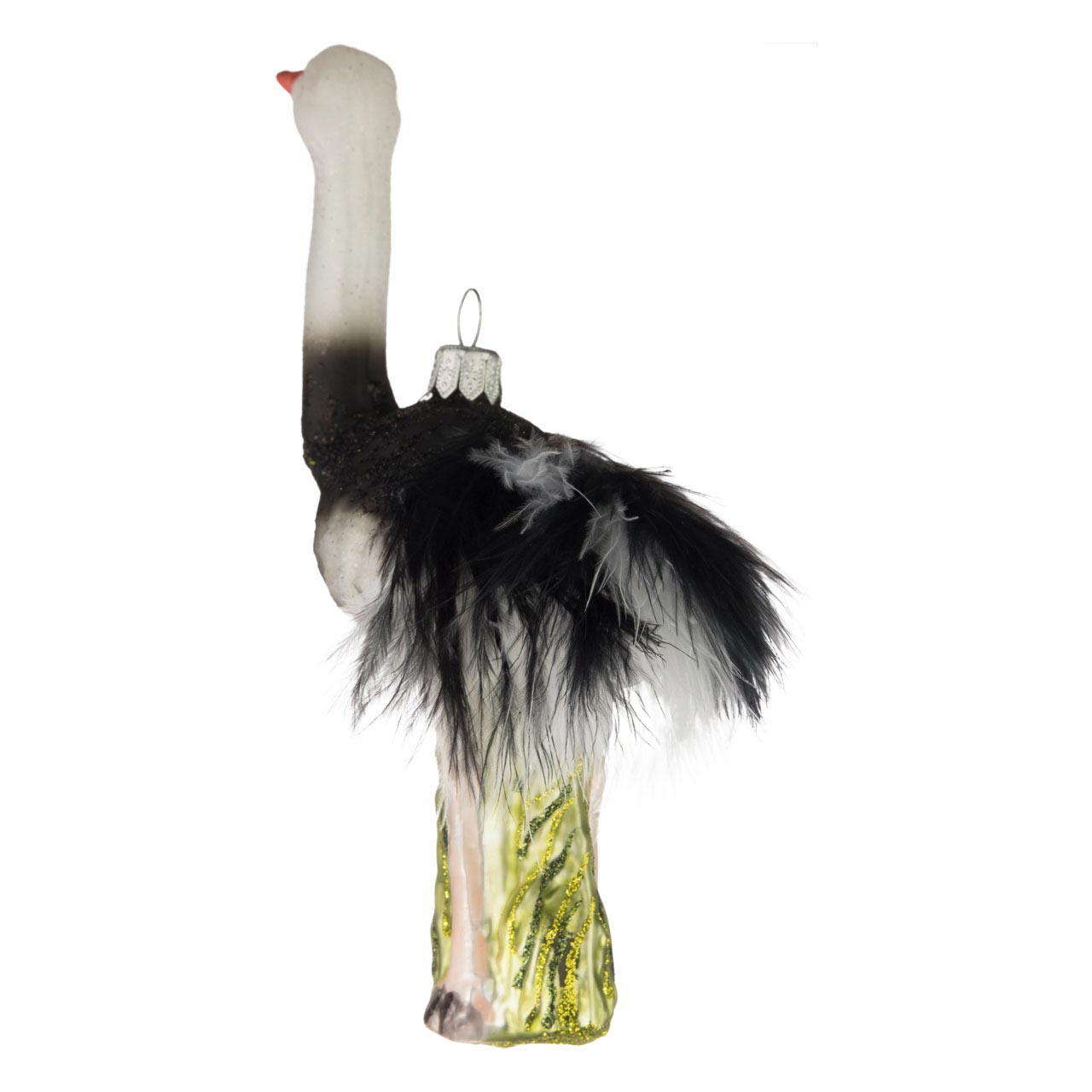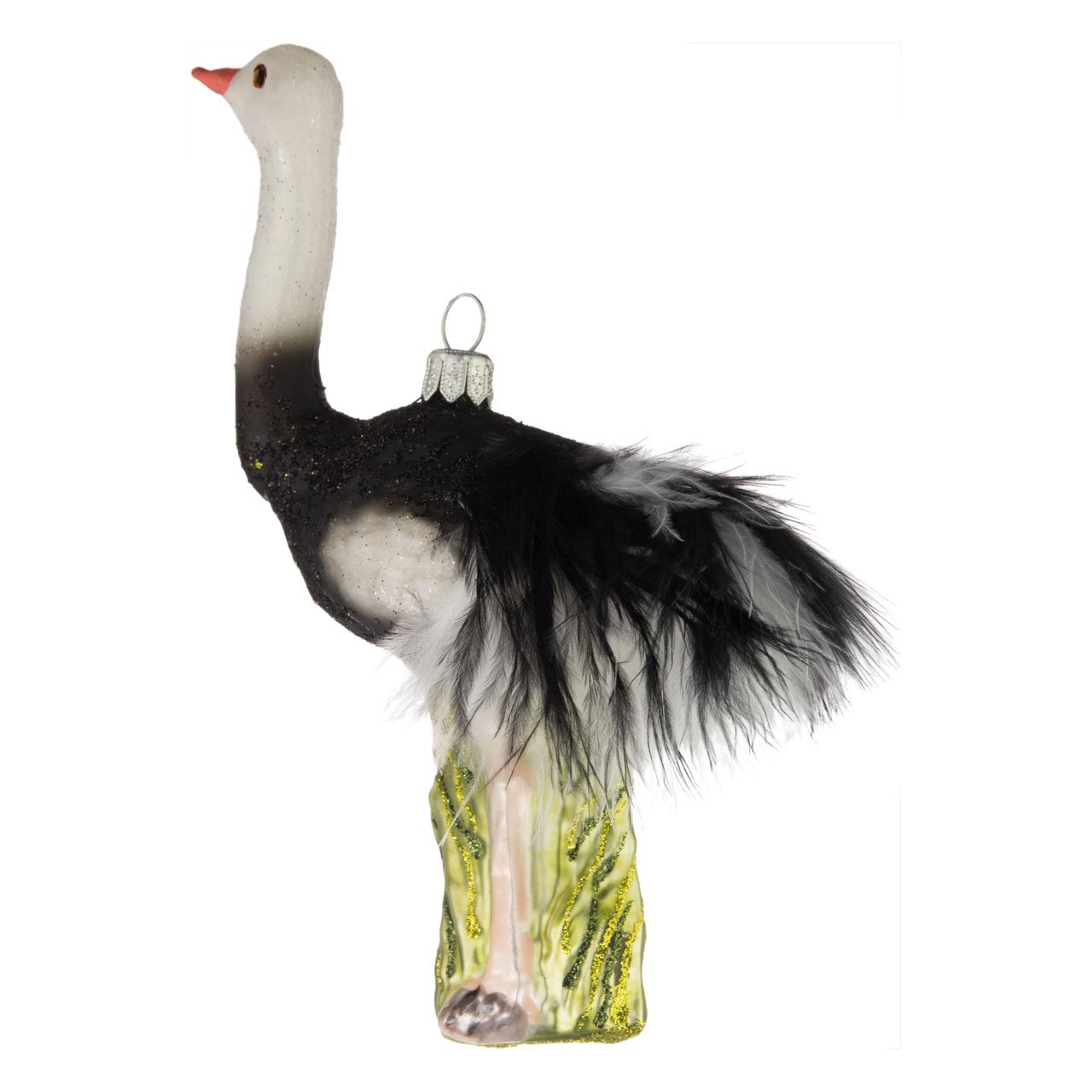 In elegantem Mattweiß wie Schwarz zieht der Strauß nun auch als Christbaumfigur bewundernde Blicke auf sich: Vornehm beglitzert reckt das elegante Tier seinen langen Hals mit orangem Schnabel in die Höhe. Die hautfarbenen Beine stehen dabei im bauchhohen Glitzergras. Absolutes Highlight: echte, angeklebte weiße und schwarze Federn verleihen dem hinteren Rumpf einen lockerleichten, luftigen Schwung.