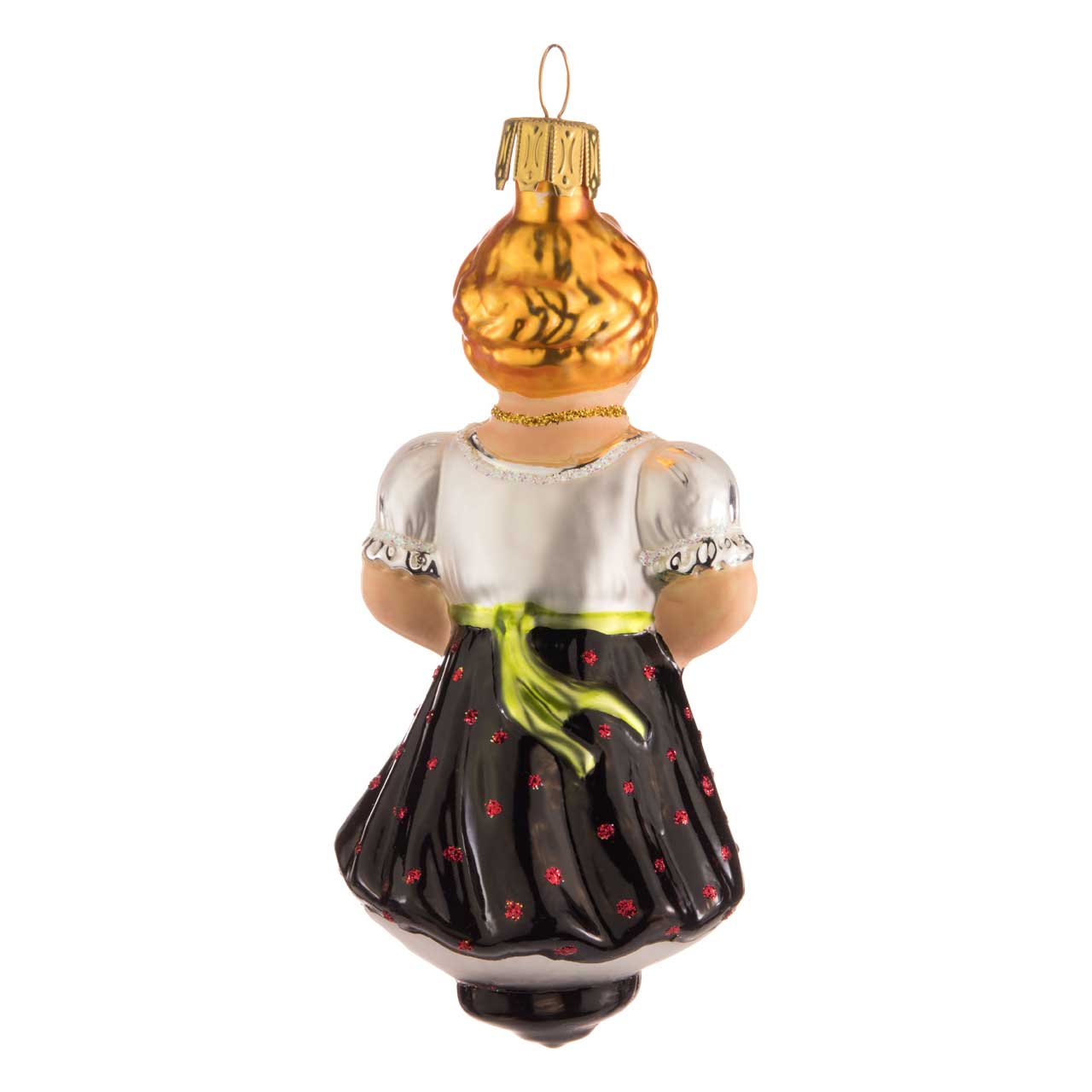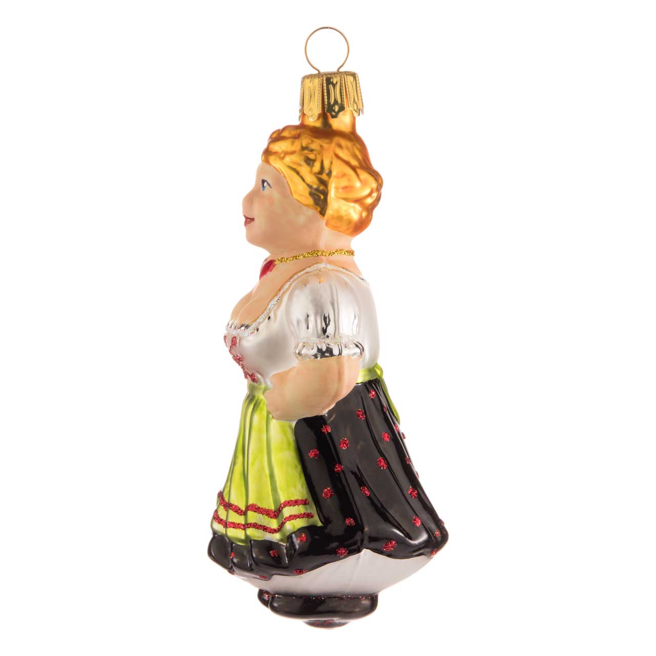 Ein dirndl-ähnliches Gewand trägt es nämlich bestehend aus einem schwarzen, glänzenden Rock, der mit rot glitzernden Pünktchen versehen wurde. Hellgrün schimmert die matt lackierte Schürze darüber, die mit zwei roten Linien verziert wurde. Ebenfalls rot glitzernd präsentieren sich auch die Schnüre der Trachtenbluse, die weiß und silbern mit weitem Ausschnitt und niedlichen Puffärmeln daherkommt. Eine blonde, um den Kopf drapierte Flechtfrisur bildet neben der goldenen Glitzerkette mit rotem Herzanhänger den krönenden Abschluss dieser sonnigen Figur.