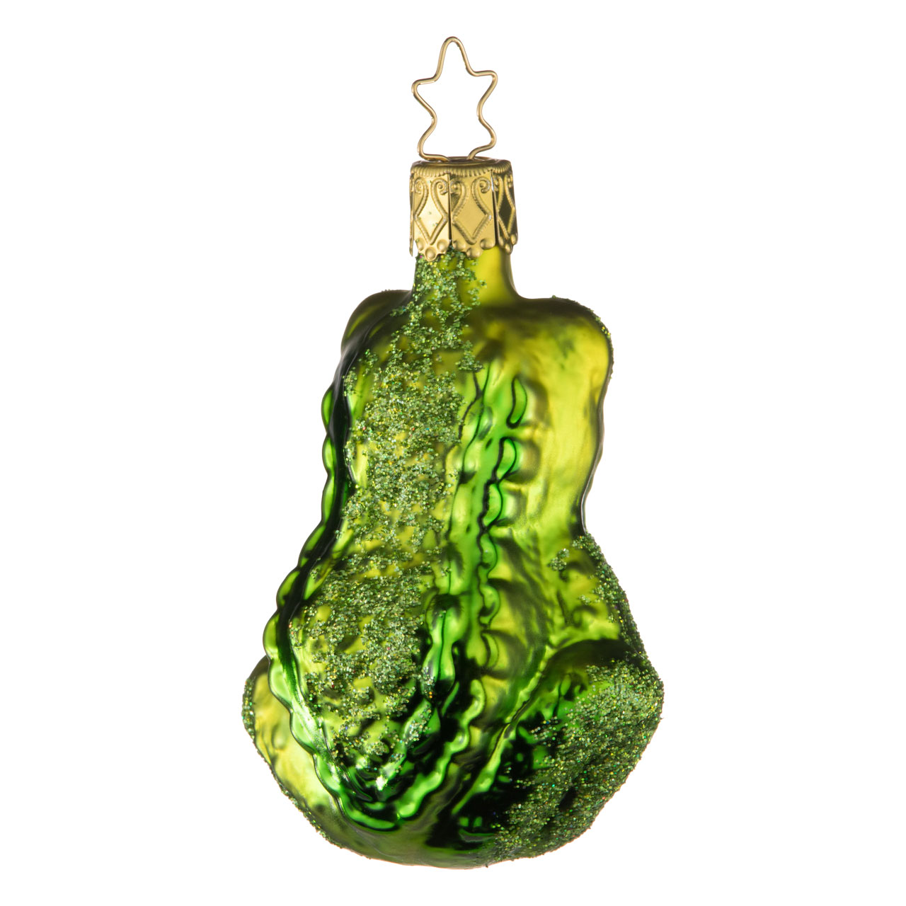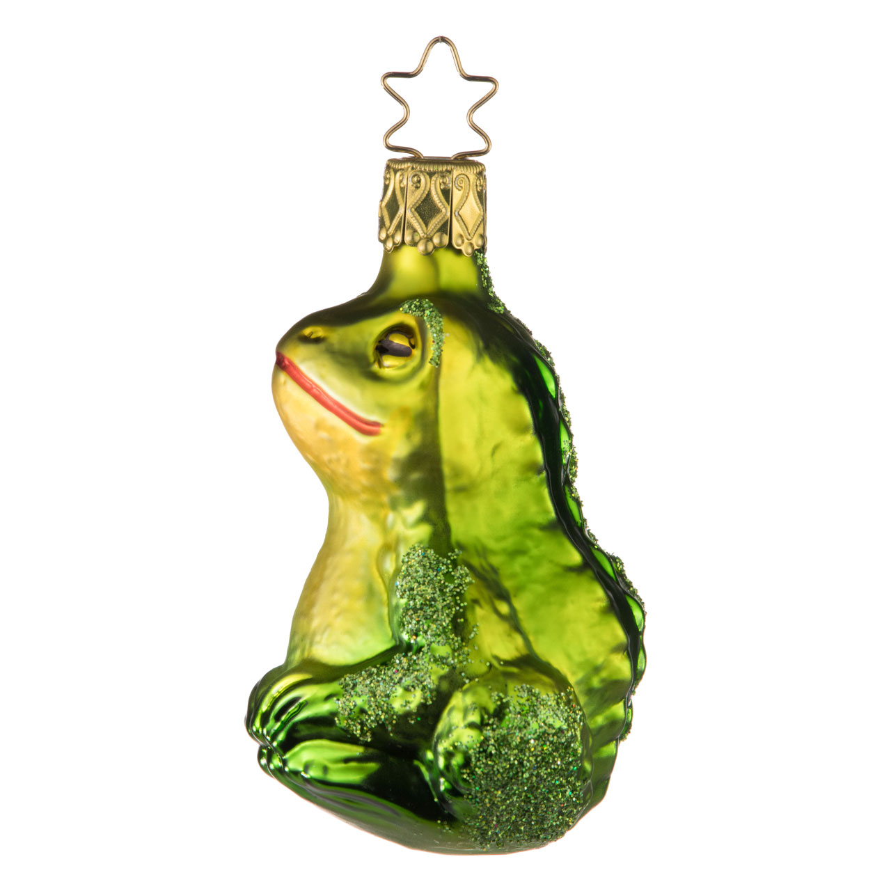 Absolut zufrieden thront er in angedeutetem Yogasitz - durch und durch entspannt und glücklich. Kein Wunder, er ist auch wirklich ein Prachtexemplar. Mit raffinierter Airbrushtechnik besprüht leuchtet seine Frosch-Haut gleich in mehreren changierenden, frischen Grüntönen. Ein knallroter Strich markiert die Lippen des breiten Mauls. Die großen Kulleraugen weisen mit schmalen Pupillen einen gechillten Blick auf und Glitzerpuder auf Armen und Rücken sorgen für einen glamourösen Wow-Effekt. Nicht verwunderlich also, dass der Tümpel-Casanova seine silberne Aufhängung im wahrsten Sinne des Wortes wie eine Krone trägt.