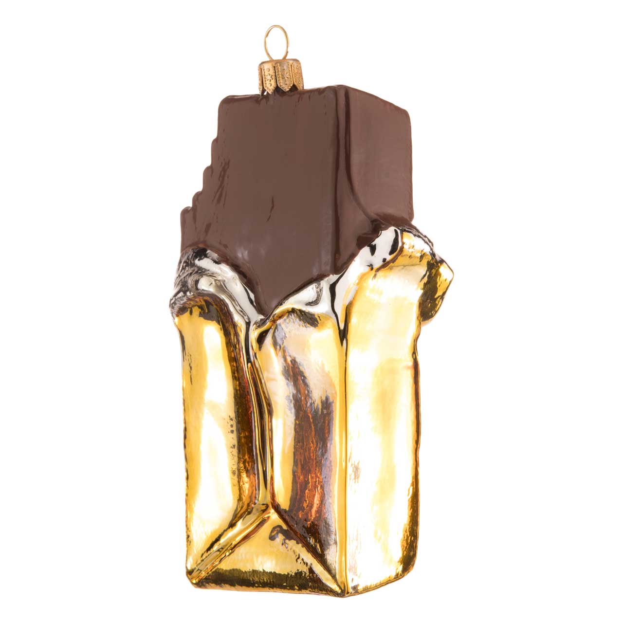 Zu verführerisch sieht die Glasfigur aber auch aus. Dreimal vier Stücke prägen auf der Vorderseite ihre Tafel, die zur Hälfte in goldenes, auf der Innenseite silbern glänzende Folie verpackt wurde. Halb-halb präsentiert sie sich somit wie ausgepackt und aufgekrempelt. Zum Anbeißen schön - und dennoch unverderblich noch Jahrzehnte lang.