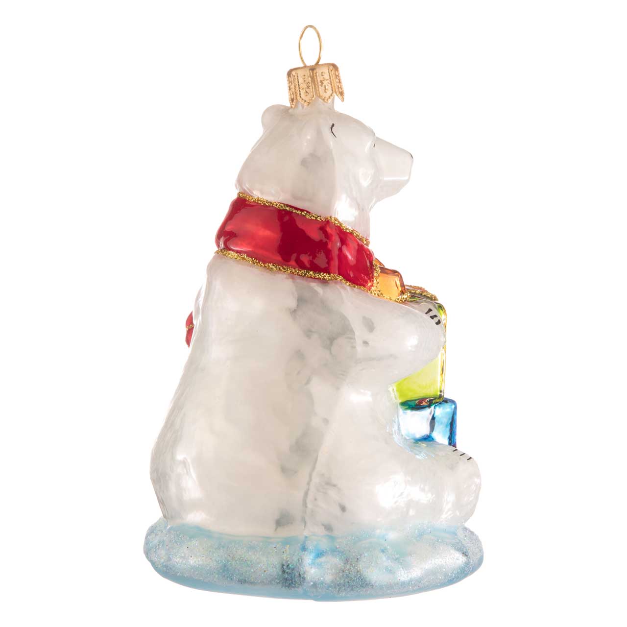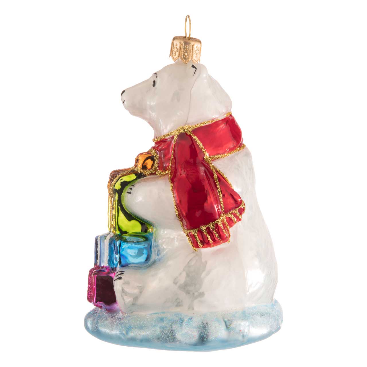 Freundlich schaut er aus seinen schwarzen Äuglein und mit der schwarzen Schnauze drein. Mit schwarzem Lack wurden ebenfalls die Krallen, Augenbrauen sowie Ohrenkonturen sorgsam ins weiße Fell gemalt. Ein dicker, rot glänzender Schal mit gold glitzerndem Rand umhüllt wärmend den Hals und ergänzt die bunten Farben des Geschenkestapels: pink, hellblau, grün und gelb.