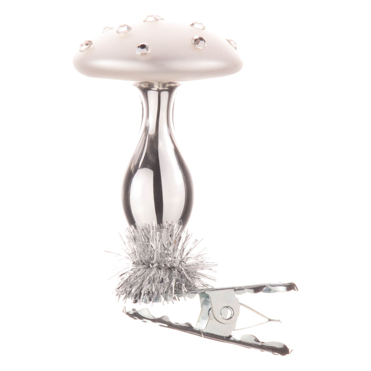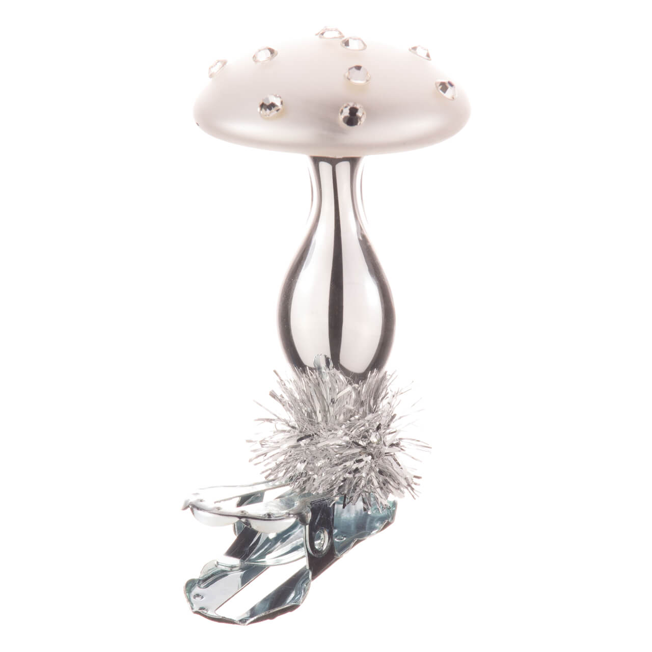 Wie ein Spiegel so klar glänzt der kegelförmige, leicht bauchige Stiel, mit dem er auf der silbernen Klemme thront, mit der er wiederum im Tannengrün befestigt wird. Eine silbern glänzende Pfeifenputzergirlande lässt an kunstvolle Gradhalme denken, was einen natürlichen Schein erzeugt. Mit einem matten Silberweiß bildet die sanft gewölbte Kappe einen herrlichen Kontrast zu all dem Glanz. Echte Swarovski-Kristalle, die so klar geschliffen sind, dass sie an echte Diamanten erinnern, sorgen für einen wahrhaft luxuriösen Abschluss des niedlichen Figürchens.