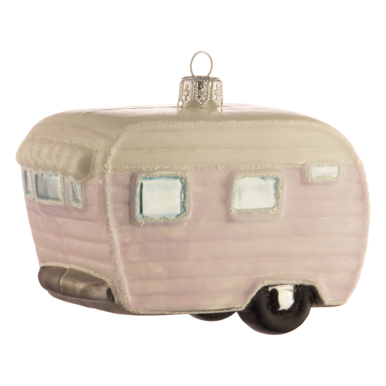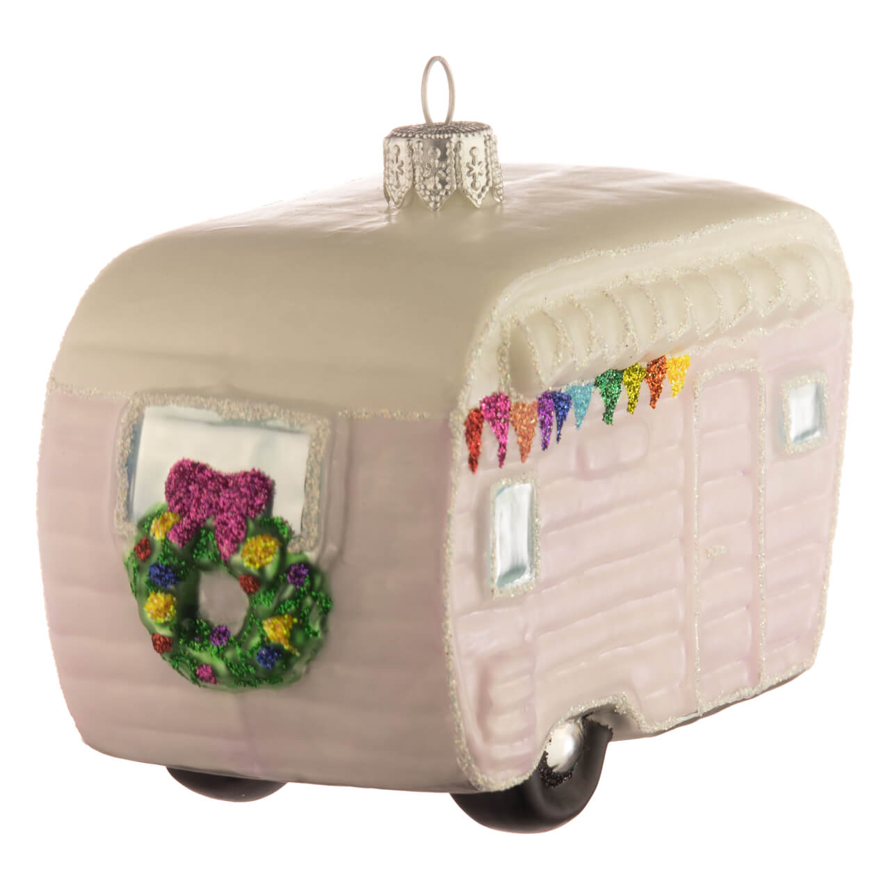 Camper-Traum mit Charme! Wer beim Stichwort Wohnwagen etwa an Holzschrankfurniere im Gelsenkirchener Barock oder gar an braune Troddelvorhänge denkt, hat bei diesem herrlichen Modell weit gefehlt. Pastelltöne, Retro-Schlichtheit und wenige, aber dafür bunte, liebevolle Accessoires lassen den rosa farbenen Caravan für den Tannenbaum dafür ganz schnell zum schicken Lieblingsteil werden.