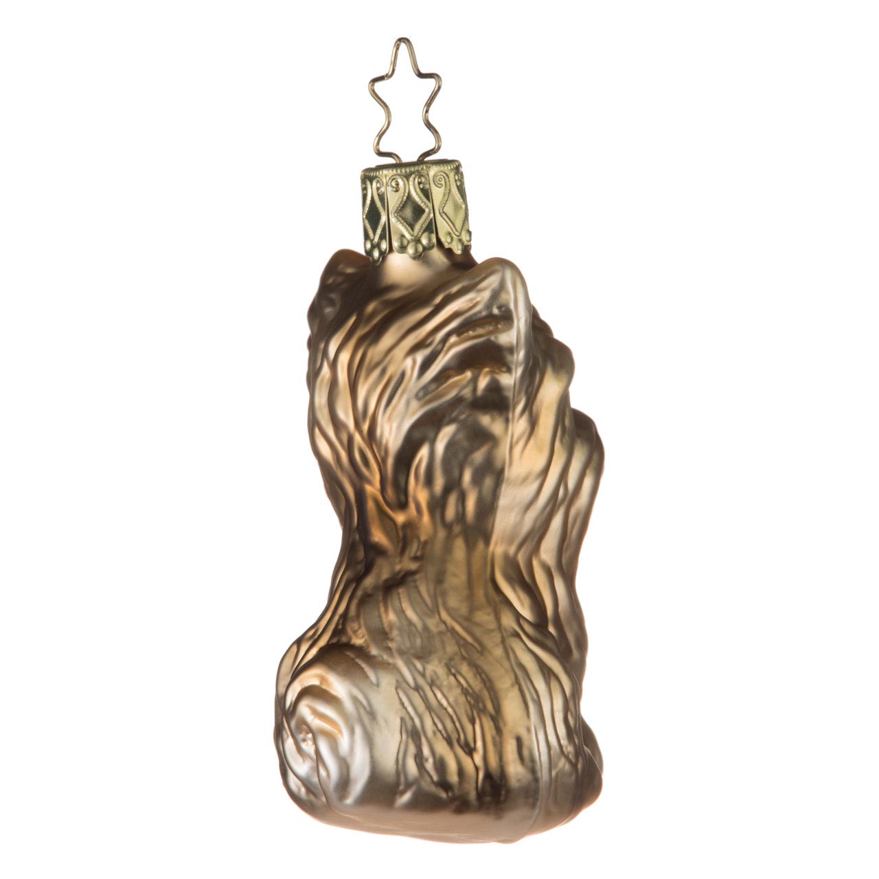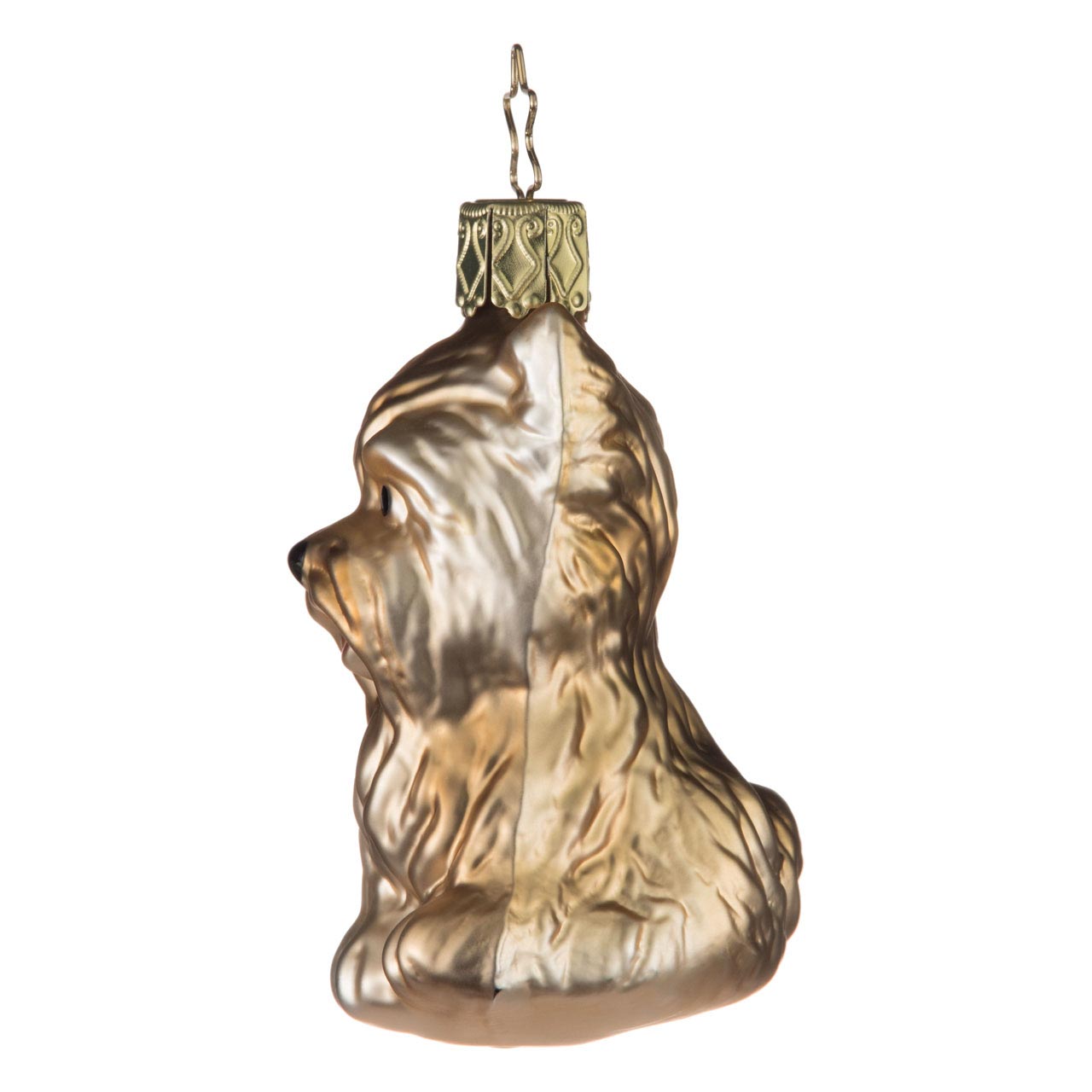 Ein Hund mit Charakter, so ist er wohl am besten zu beschreiben. Wachsam, furchtlos, aufgeweckt und intelligent soll er ebenfalls sein. Ein starker Typ zum Liebhaben eben. Und als Glasanhänger für den Baum? Da macht er natürlich eine Topfigur. Artig im Sitz schaut er mit treuherzigen, schwarzen Hundeaugen dem Betrachter entgegen. Eine rosa Zunge kurz aus dem Mäulchen hervorlugend. Mit welpenartigen Proportionen und elegant schimmerndem, changierenden hellbraun-silbrigem Fell.