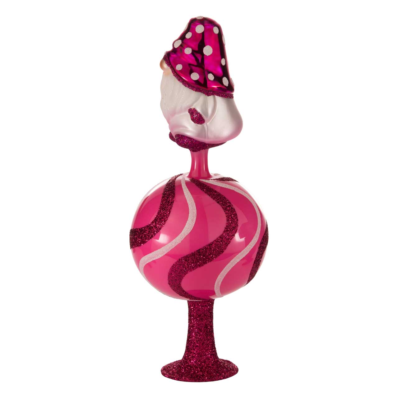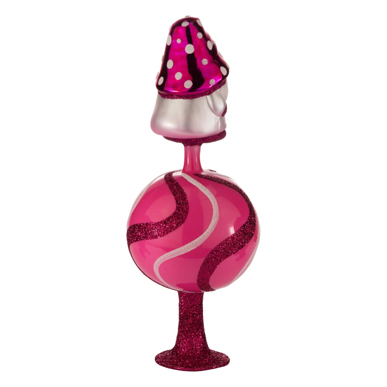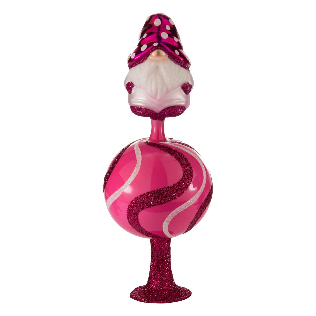 Was ist das? Eine Christbaumspitze mit Augenzwinkern, auch wenn bei dem süßen, kleinen Wichtel ausgerechnet die Augen gar nicht zu sehen sind. Nur die lustige Knollennase schaut nämlich unter seiner XXL-Mütze hervor, die je nach Variante matt rot oder glänzend pink schimmert und wie ein Fliegenpilz mit weißen Glitzertupfen unterschiedlicher Größe bedacht wurde.