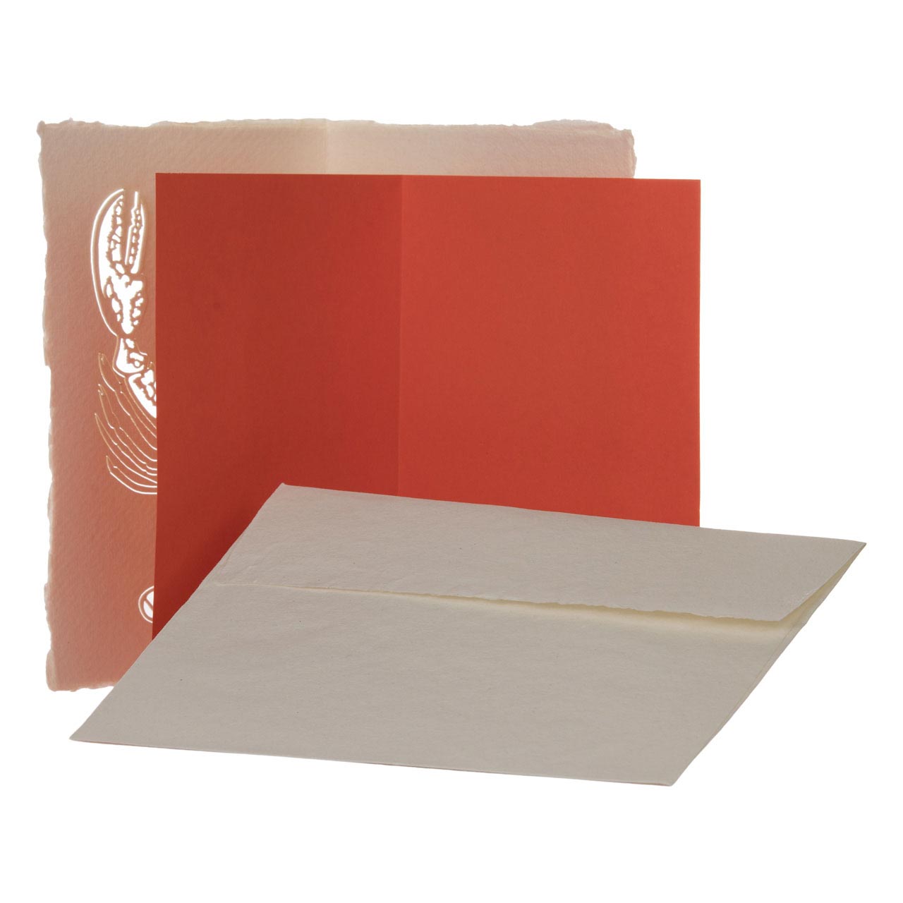 Herrlich frisch und maritim: Ob als Einladung für's luxuriöse Dinner oder zur Erinnerung an den letzten Urlaub am Meer - diese handgeschöpfte Büttenkarte veredelt einfach jeden Gruß. Aus recycelter Baumwolle hergestellt, wurde das Motiv millimetergenau mit Laser in das Papier gefräst. Ein farbiger Einleger, in diesem Falle natürlich in orangem Hummerrot, sorgt für herrliche Kontraste.
