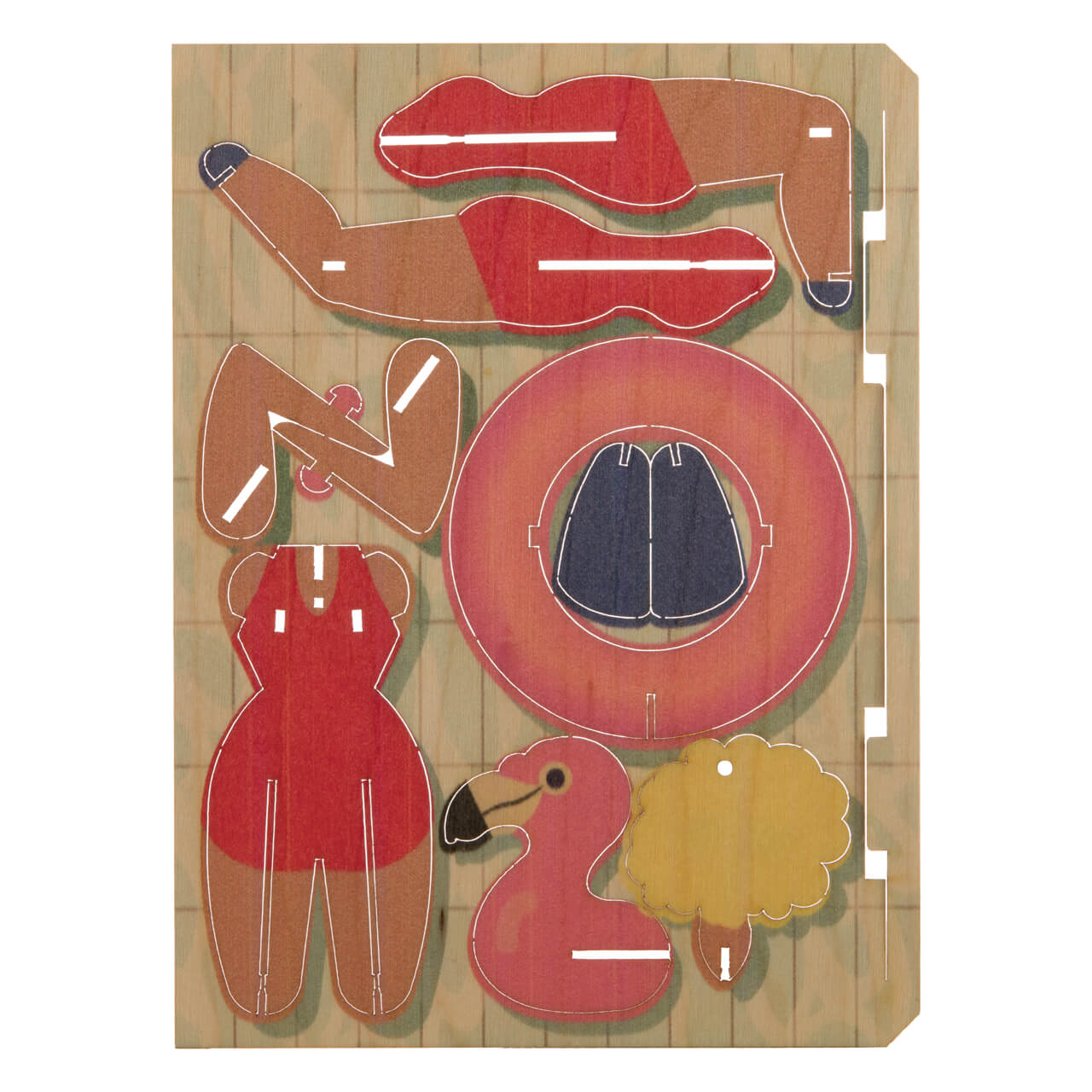 Mehr als nur Worte, mehr als eine Karte: Wer diesen Umschlag öffnet, wird große Augen machen. Denn nicht nur eine hellblaue A6 Doppelkarte aus Papier mit dem pinkfarbenen Schattenriss einer badenden Strandschönheit überbringt die lieben Grüße einer guten Freundschaft. Auch eine dünne Holzkarte aus 1mm starkem Birkensperrholz samt Bauanleitung auf deutsch, englisch und französisch flattert daraus hervor.