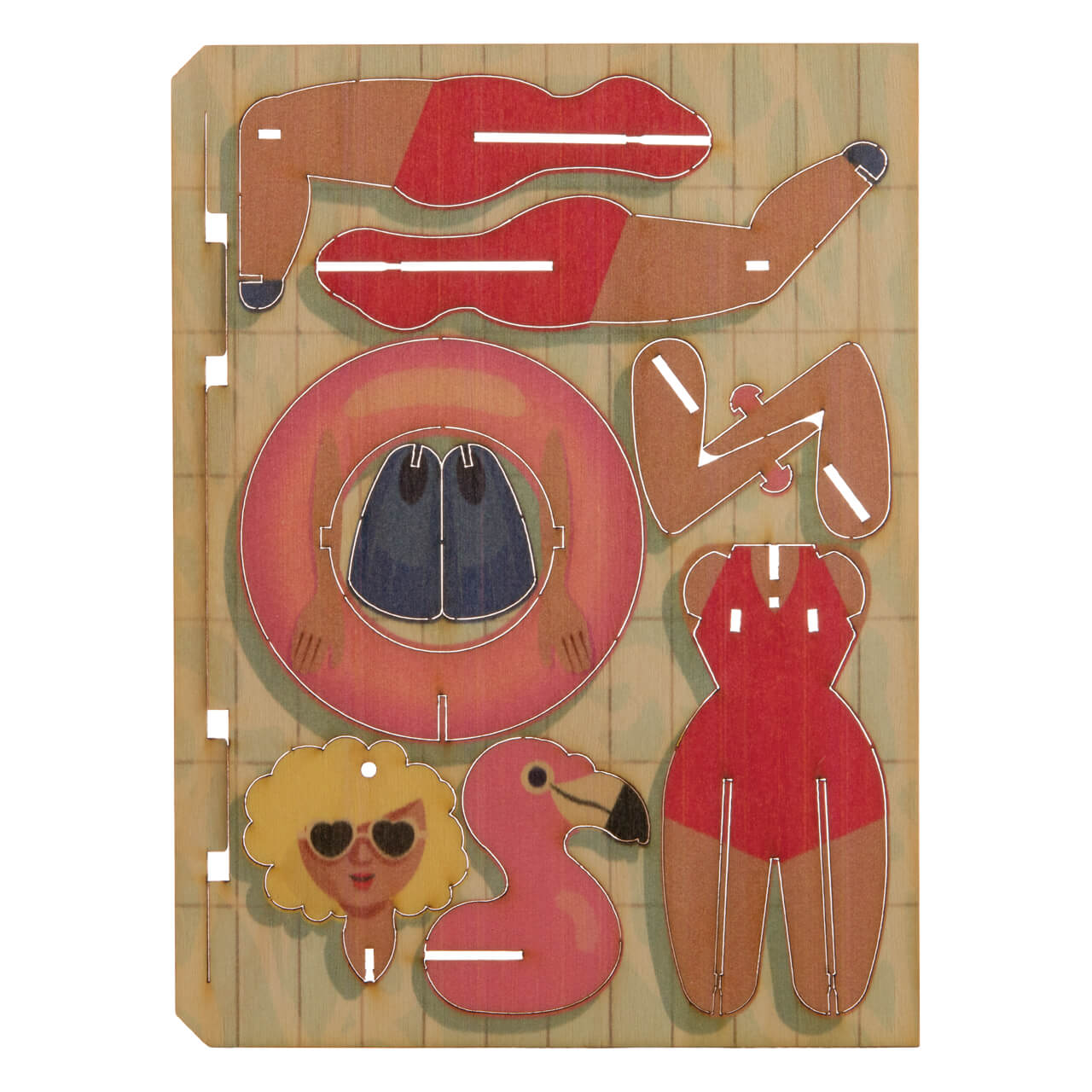 Die spannende Aufgabe für den Empfänger: Alle mit dem Laser ausgeschnittenen Teilchen vorsichtig und gegebenenfalls mit Hilfe eines Cuttermessers heraustrennen und gemäß Anleitung kunstvoll zum dreidimensionalen DeKo-Objekt zusammenstecken. Tadaa, fertig ist sie, die Badenixe für jede Menge sommerliches Flair am Arbeitsplatz, an der Küchenlampe, am Fensterflügel. An einem dünnen Zwirnsfaden aufgehängt, findet sie sicher schnell einen geeigneten Platz, um ihre volle Lebensfreude zu versprühen. Herrlich sieht sie dabei aus mit ihrem knallroten Badeanzug, den blonden Locken, der Herzglas-Sonnenbrille, den Flossen an den Füßen und dem absoluten Highlight-Acessoire: einem pinkfarbenem Schwimmring mit Flamingo-Kopf. Wer kommt da nicht in Urlaubsstimmung?