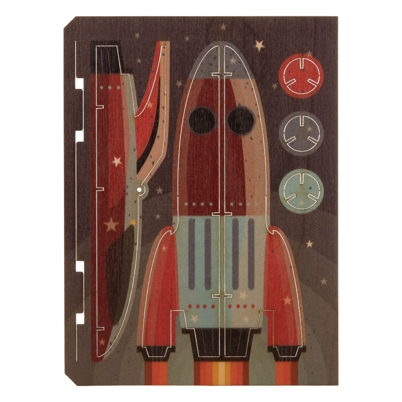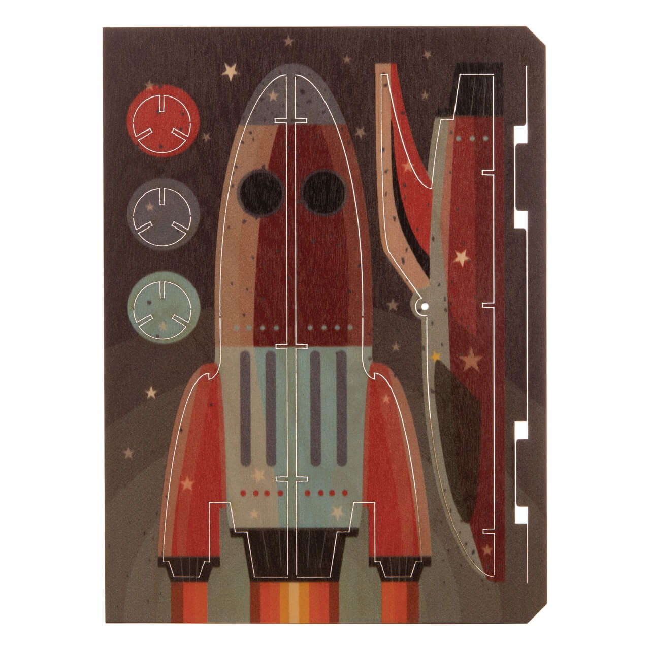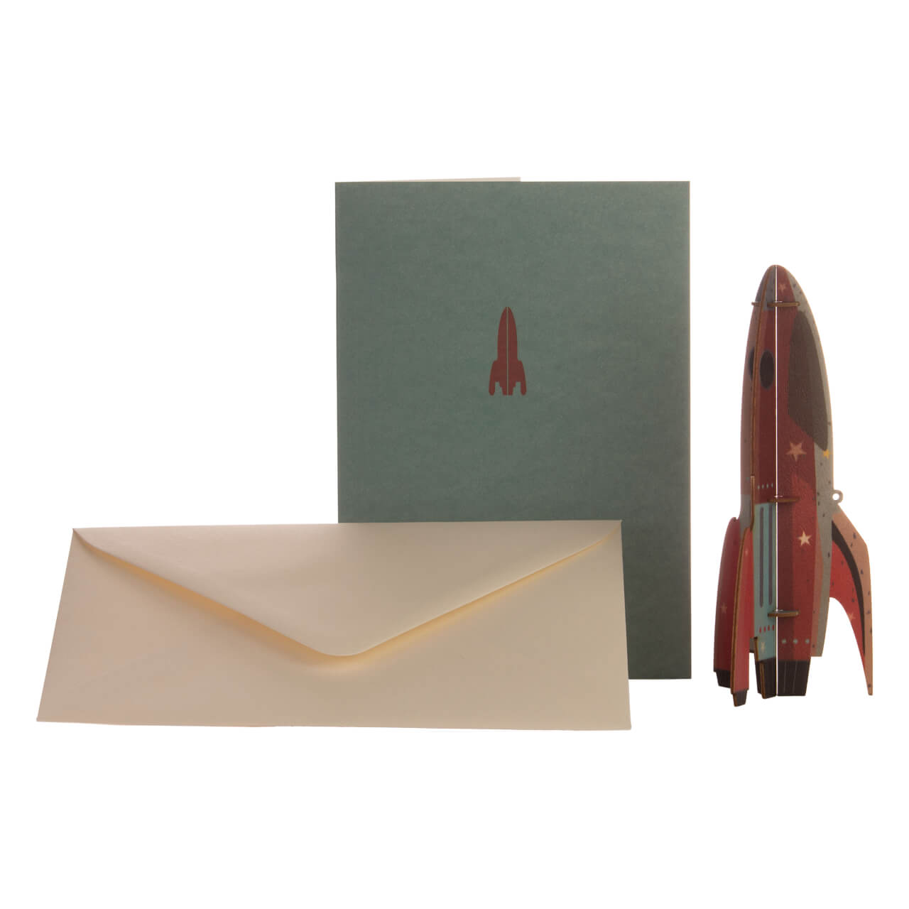 Mehr als nur Worte, mehr als eine Karte: Wer diesen Umschlag öffnet, wird große Augen machen. Denn nicht nur eine blaue A6 Doppelkarte aus Papier mit dem roten Schattenriss einer Weltraumrakete überbringt die lieben Grüße einer guten Freundschaft. Auch eine dünne, beidseitig in Farbe bedruckte Holzkarte aus 1mm starkem Birkensperrholz samt Bauanleitung auf deutsch, englisch und französisch flattert daraus hervor.