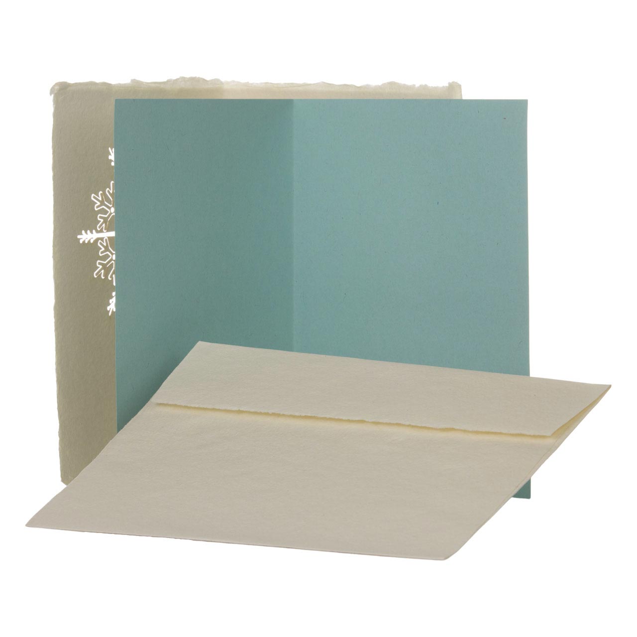 Eine prachtvolle Schneeflocke für den winterlichen oder gar weihnachtlichen Gruß: Mit dieser handgeschöpften Büttenkarte schenken Sie Ihren Worten einen besonders edlen Rahmen. Aus recycelter Baumwolle hergestellt, wurde das Motiv millimetergenau mit Laser in das Papier gefräst. Ein farbiger Einleger, in diesem Falle in frostigfrischem Eisblau, sorgt für herrliche Kontraste.