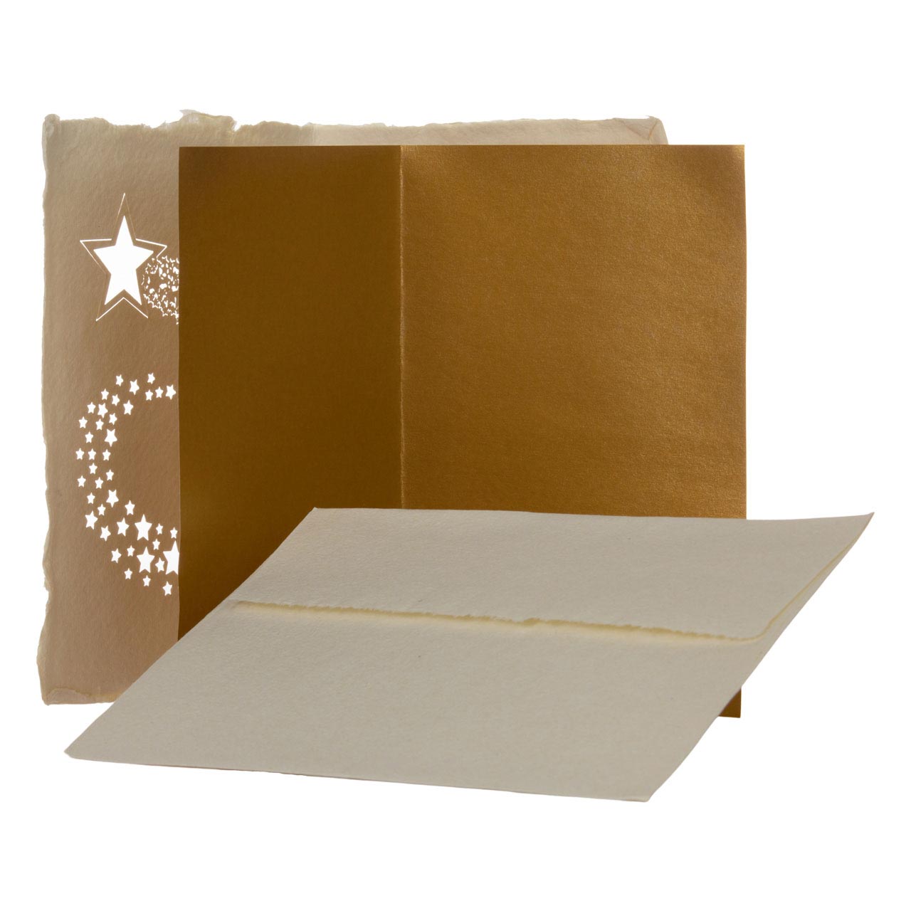 Für besondere Verkündigungen oder einen herzlichen Weihnachtsgruß: Mit dieser Sternschnuppen-Büttenkarte verleihen Sie Ihren Worten in jedem Fall einen besonders edlen Rahmen. Aus recycelter Baumwolle hergestellt, so wurde das filigrane Motiv millimetergenau mit Laser in das Papier gefräst: ein großer Stern mit Schweif aus unzähligen, kleinen Sternchen. Ein farbiger Einleger, in diesem Falle natürlich ein prachtvolles Gold, sorgt gleichzeitig für herrliche Kontraste.