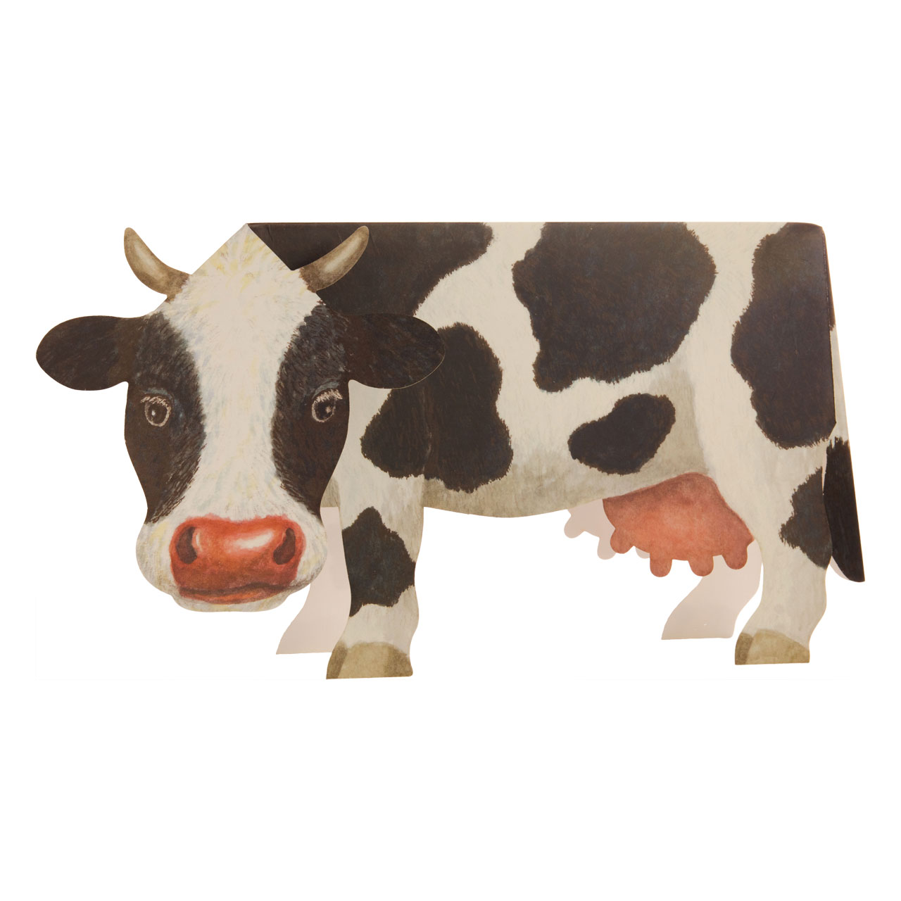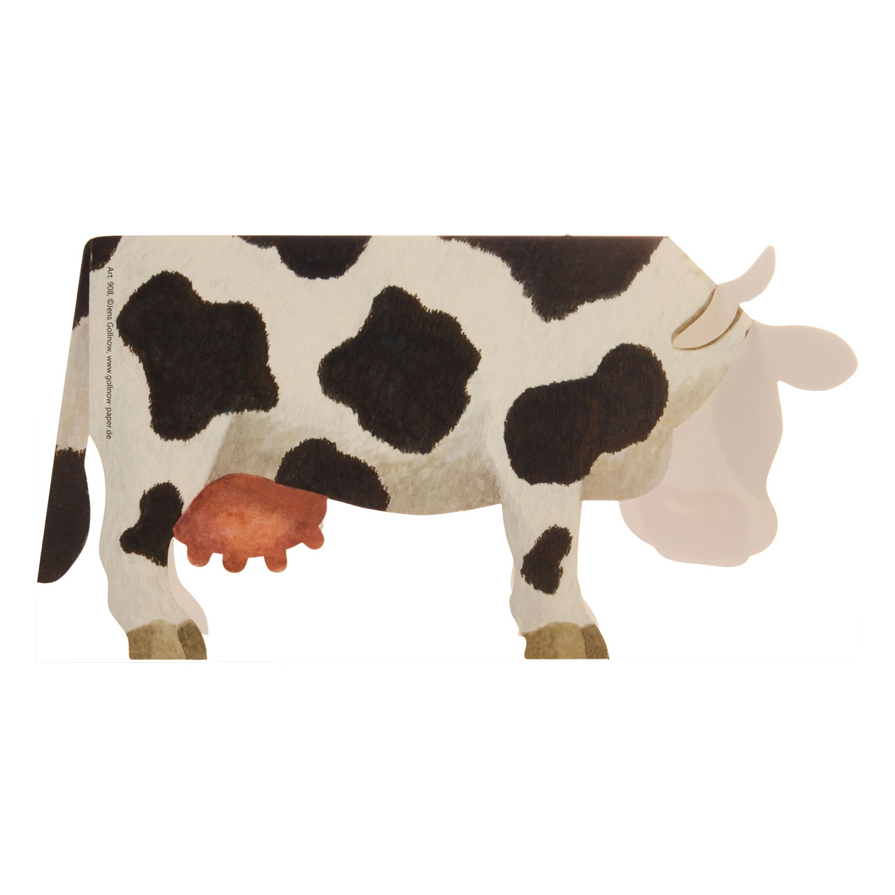 Mein einfachen Handgriffen aufgeklappt, präsentiert sich die gesamte Innenseite der klassisch schwarz-weiß gefleckten Kuh für gute Wünsche, lustige Erzählungen oder eine Einladung zum nächsten Tag des Hofes. Ein grasgrüner, länglicher Umschlag im Standardformat geleitet das hübsche Tier zudem sicher auf dem Postweg zum Empfänger, der es mit wenigen Handgriffen dann zu einer standfesten Figur aufklappen kann, die noch lange in Erinnerung bleiben wird.